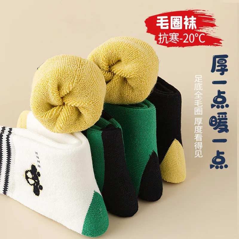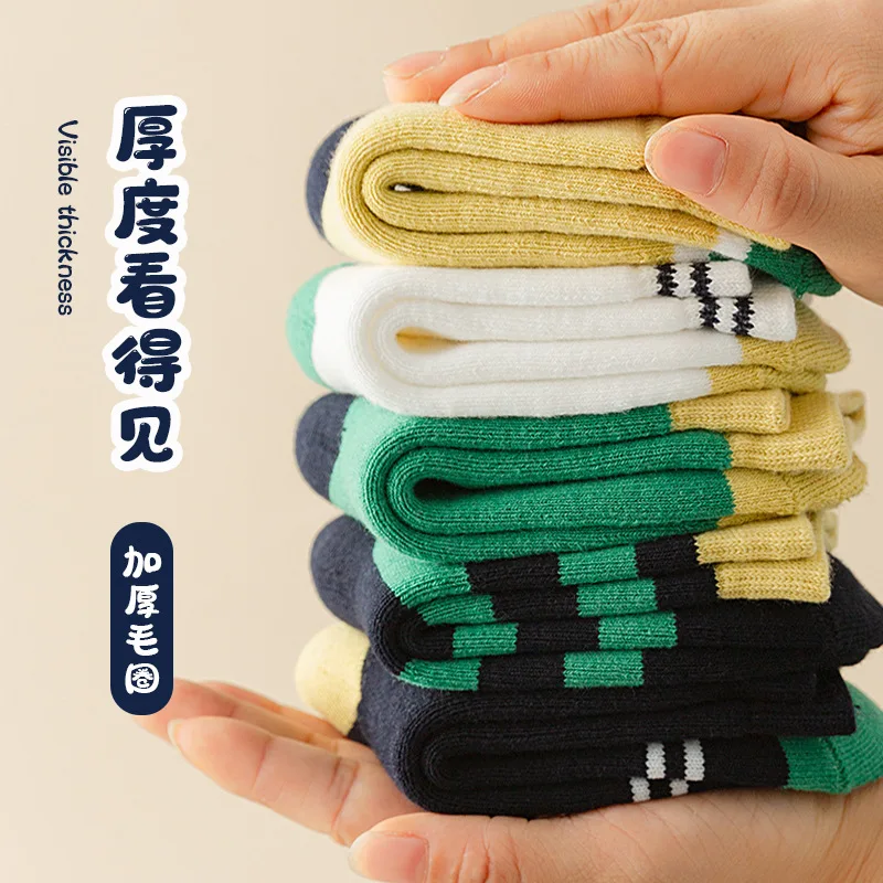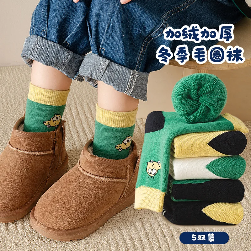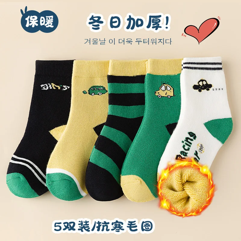 Color: Beige, Size: 10-12T - Children's Winter Socks 5 Pairs Student's Thick Cotton Socks Boys Warm Winter Socks Cartoon Racing Car Pattern