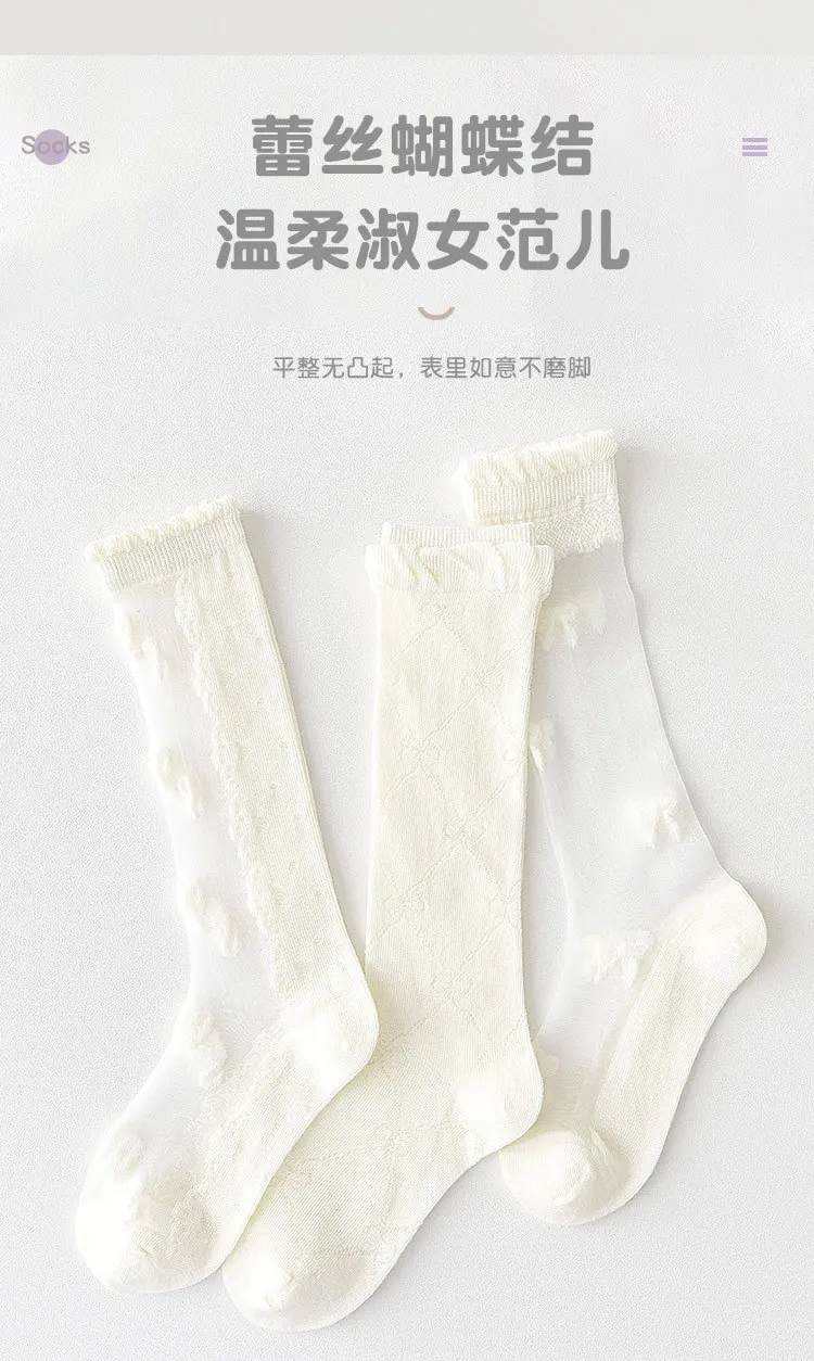 Color: Beige, Size: 2-3T - 3 Pairs/bag Girls Long Socks Summer Thin Mesh Knee Socks 4 Pairs/lot Baby Lace Princess Socks
