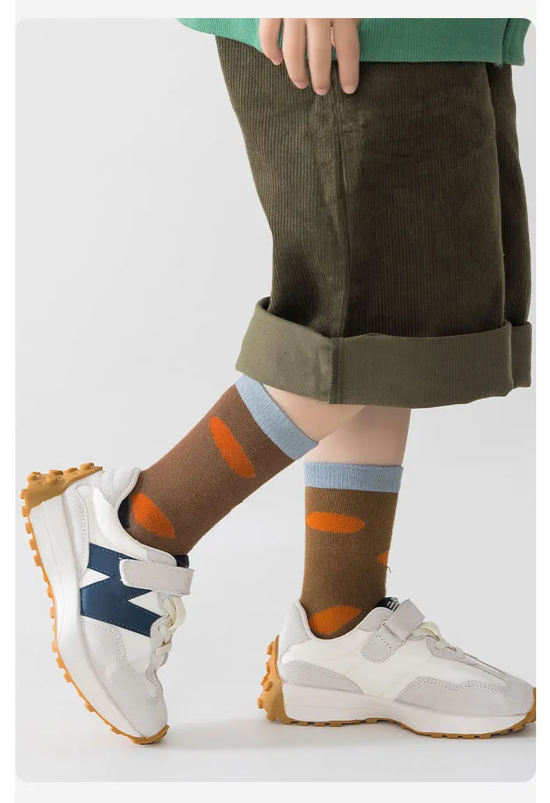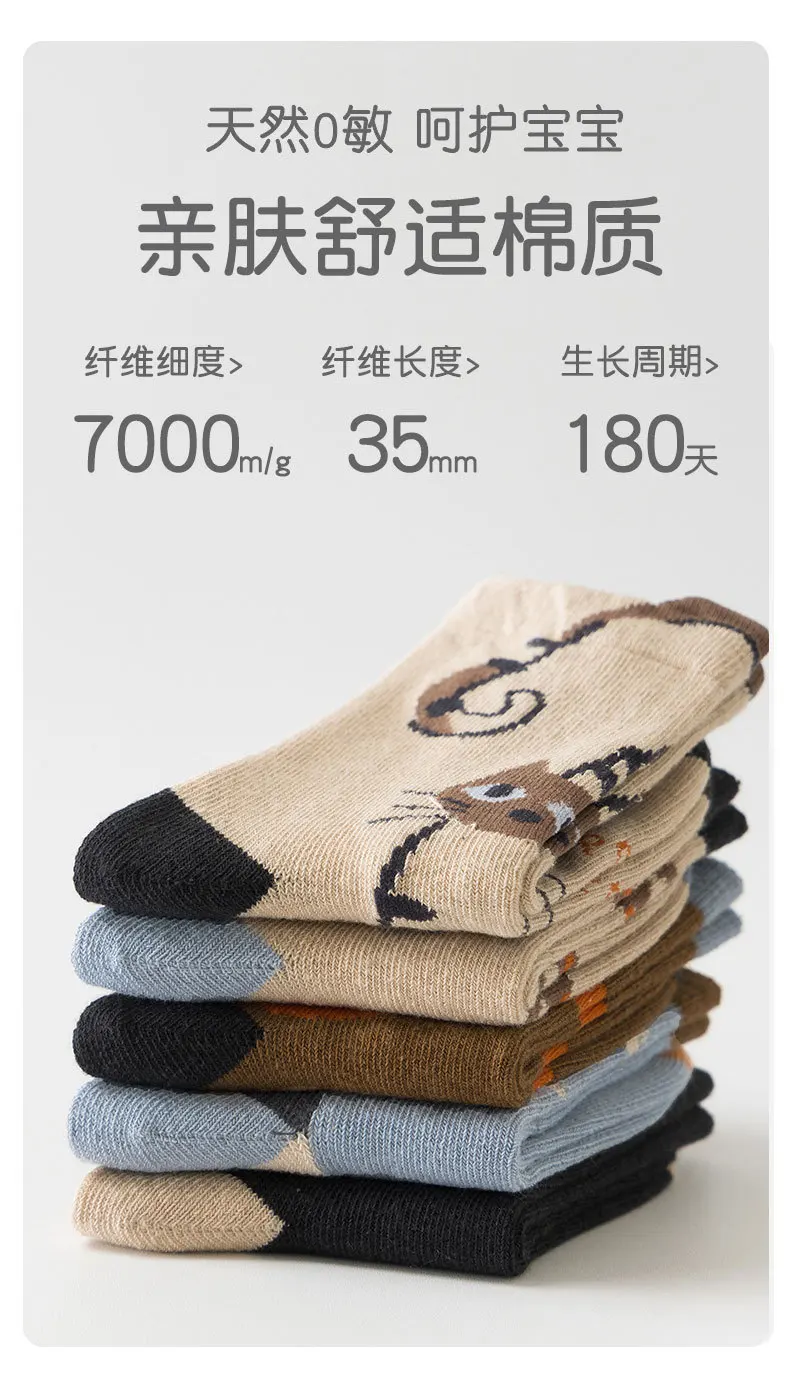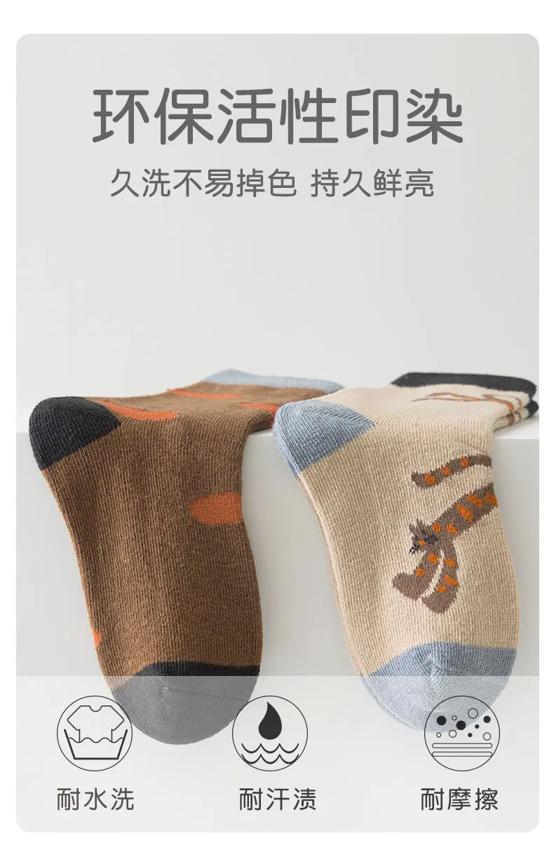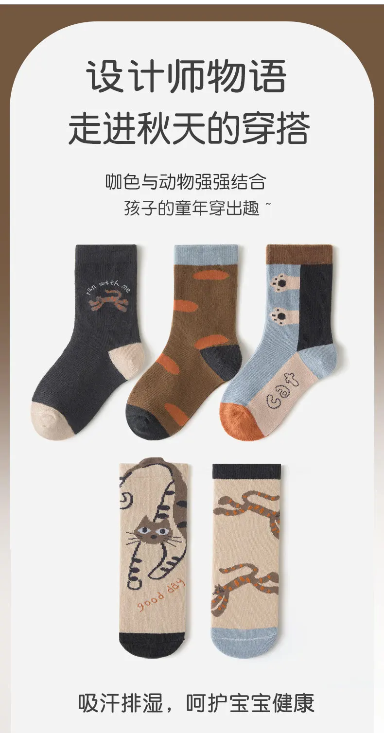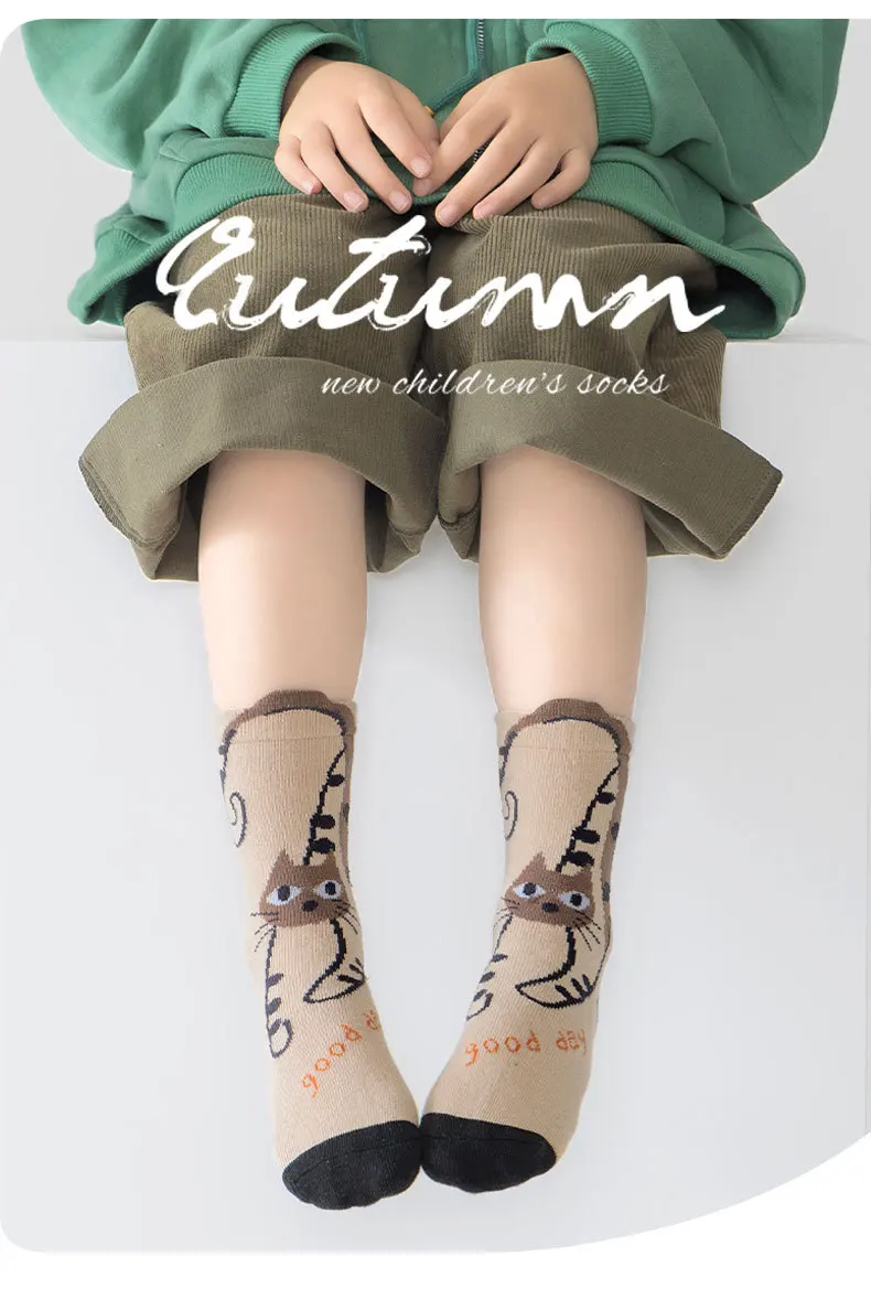 Color: Beige, Size: 2-3T - 5 Pairs Children's Socks Cotton Socks Autumn Cartoon Pattern Medium Socks Kids Boys Girls A ClassSocks