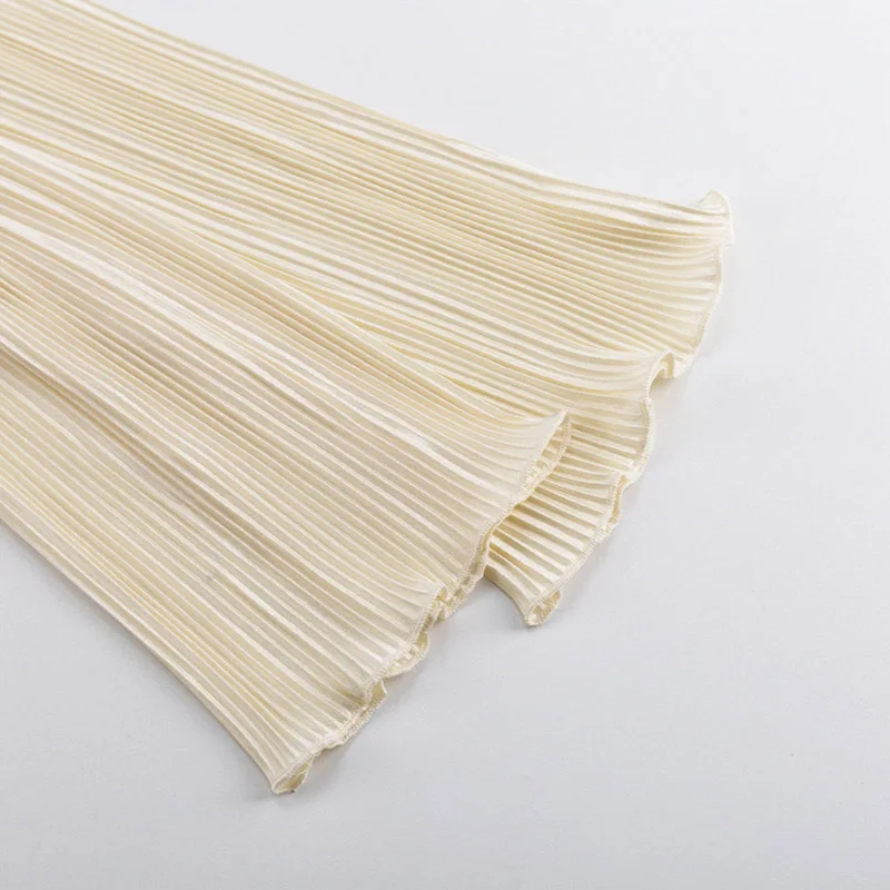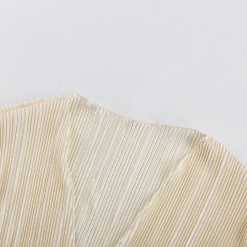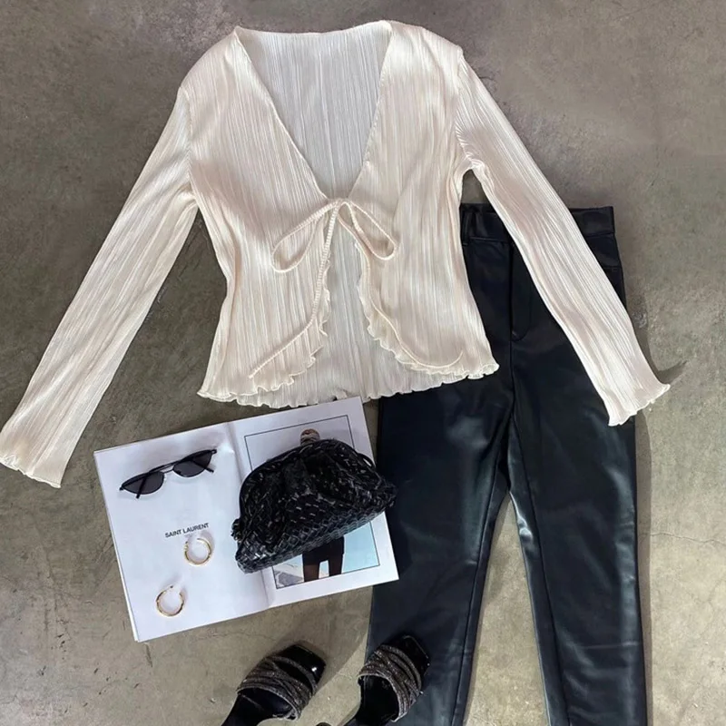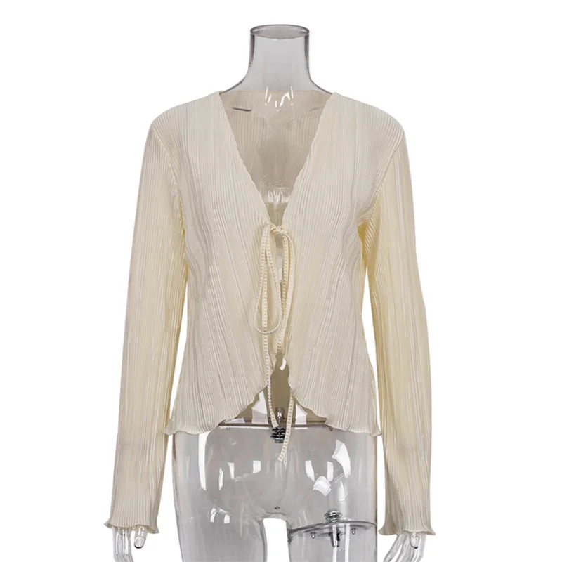 Color: Beige, Size: L - 2025 Women Pleated Plain Shirts Spring Fall Chic Long Flare Sleeve V- Neck Tie Up Cardigans Tops for Casual Party Street