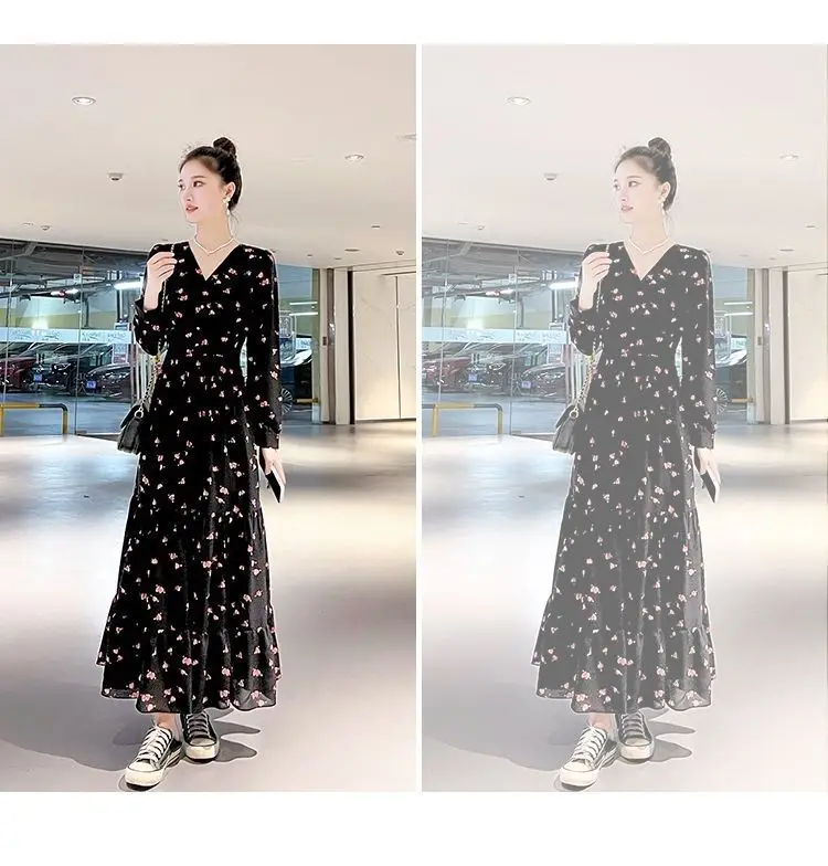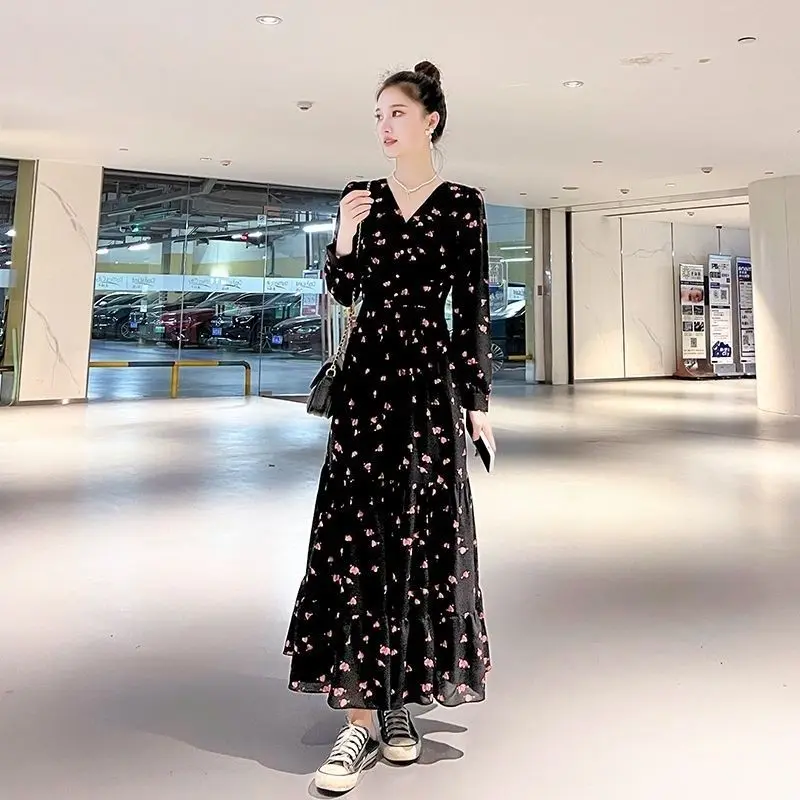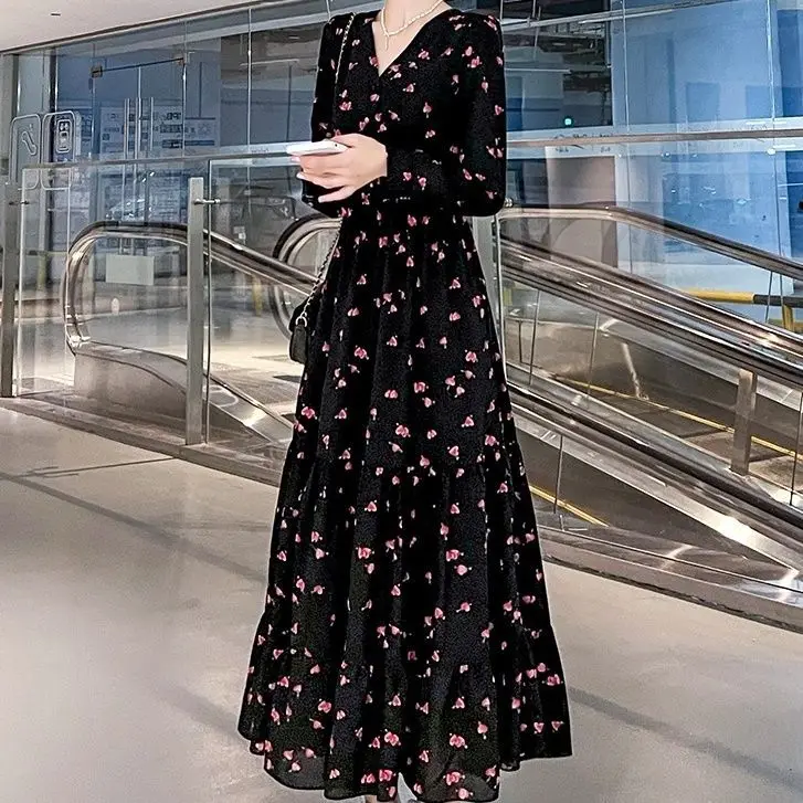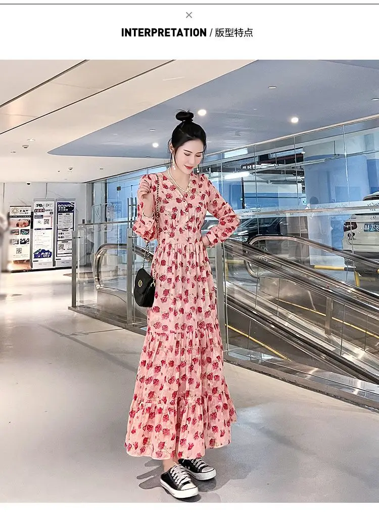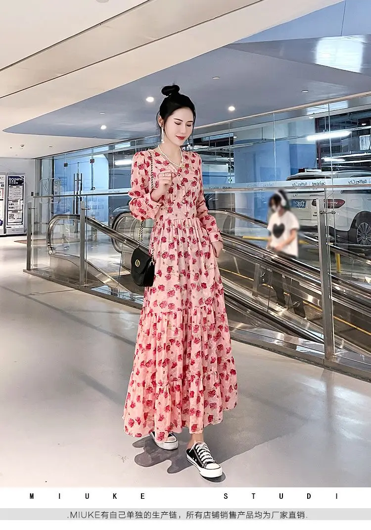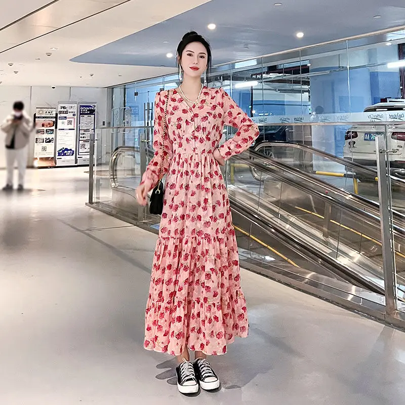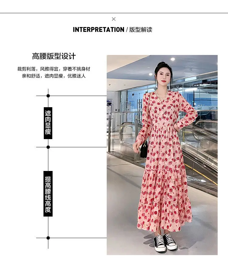 Color: Beige, Size: M - Chiffon floral dress 2024 spring/summer new high waisted slimming knee length skirt light luxury French style large skirt 3FWF