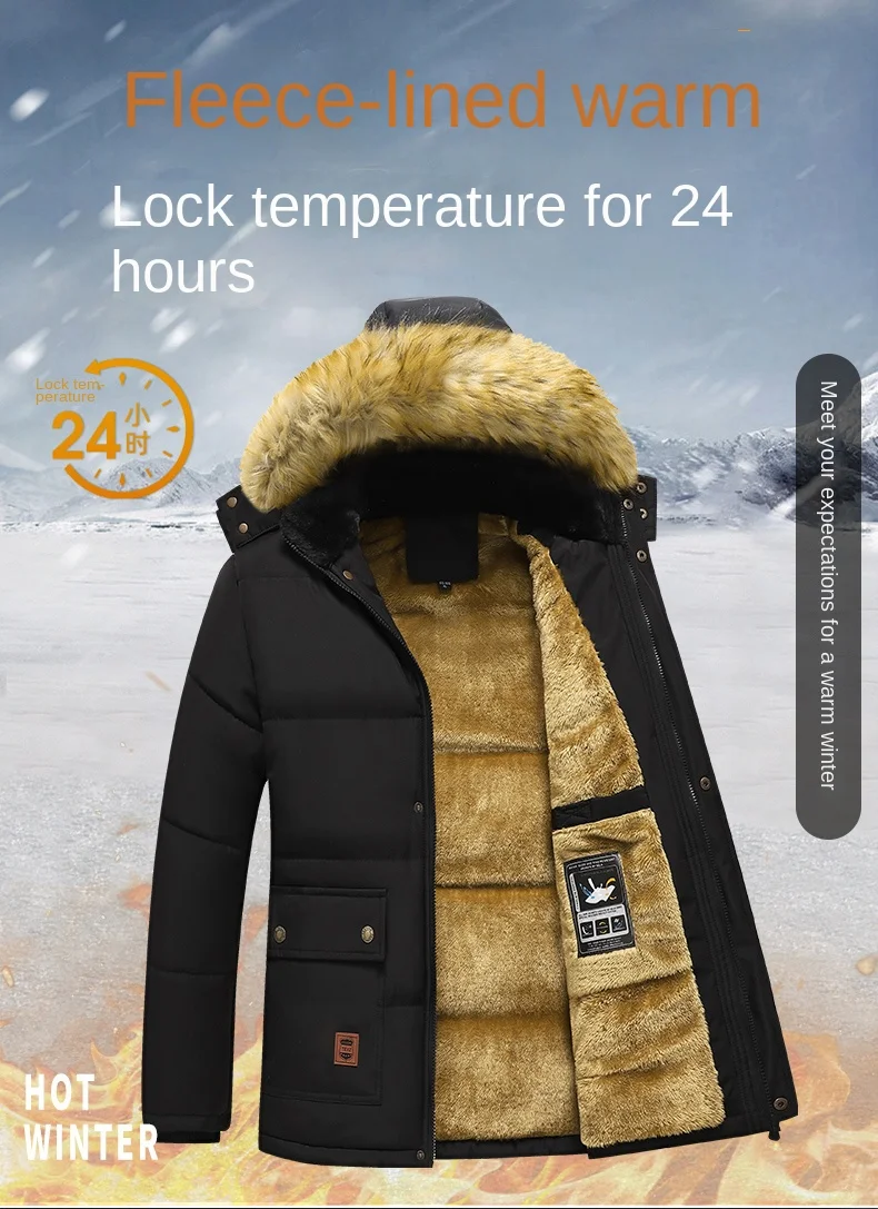 Color: Beige, Size: XL - 2024 New Men Winter Autumn Work Outwearing Parka Black Fleece Lined Thick Warm Hooded Fur Collar Coat Male Size 5XL Plush Jacket