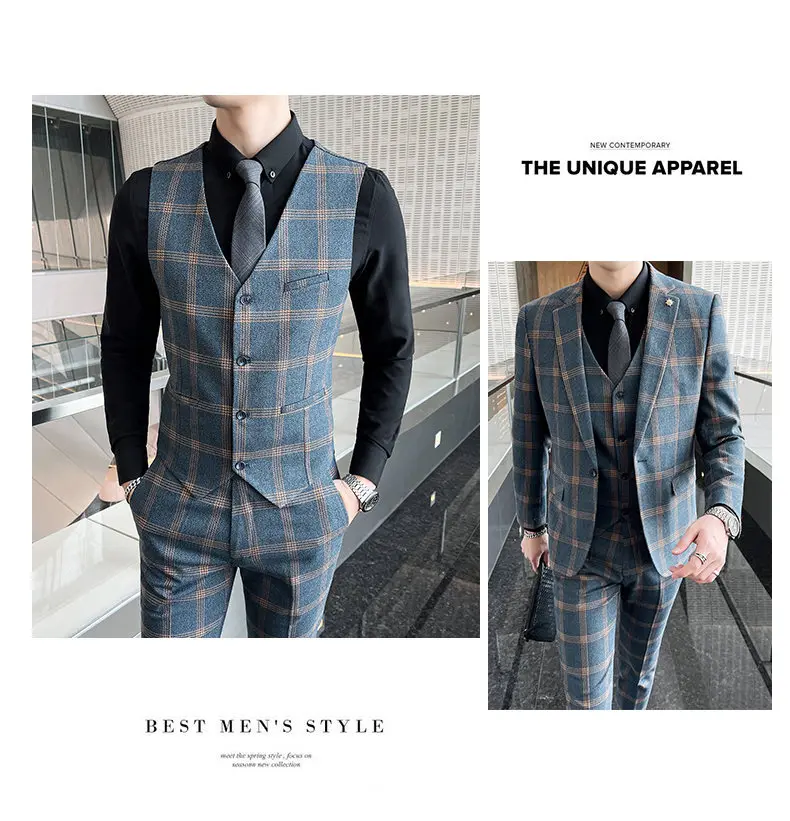 Color: Beige, Size: XL - High-quality British men's fashionable and stylish checkered casual suit set for autumn, a casual and fitted suit set of three