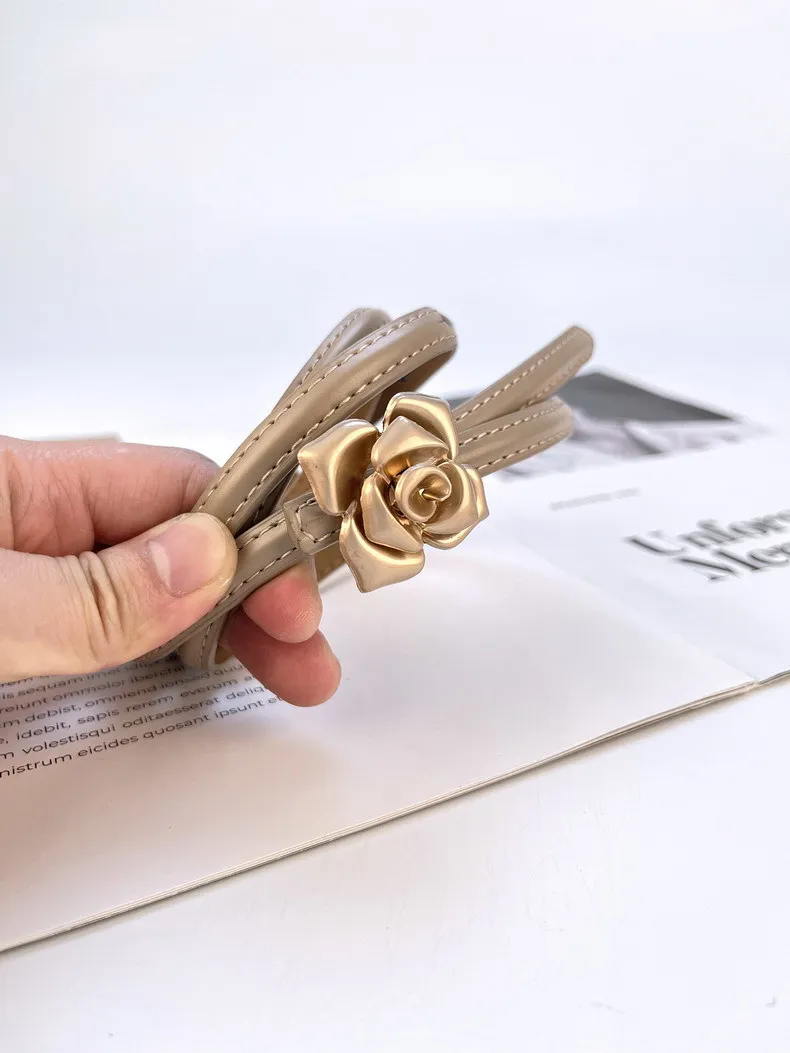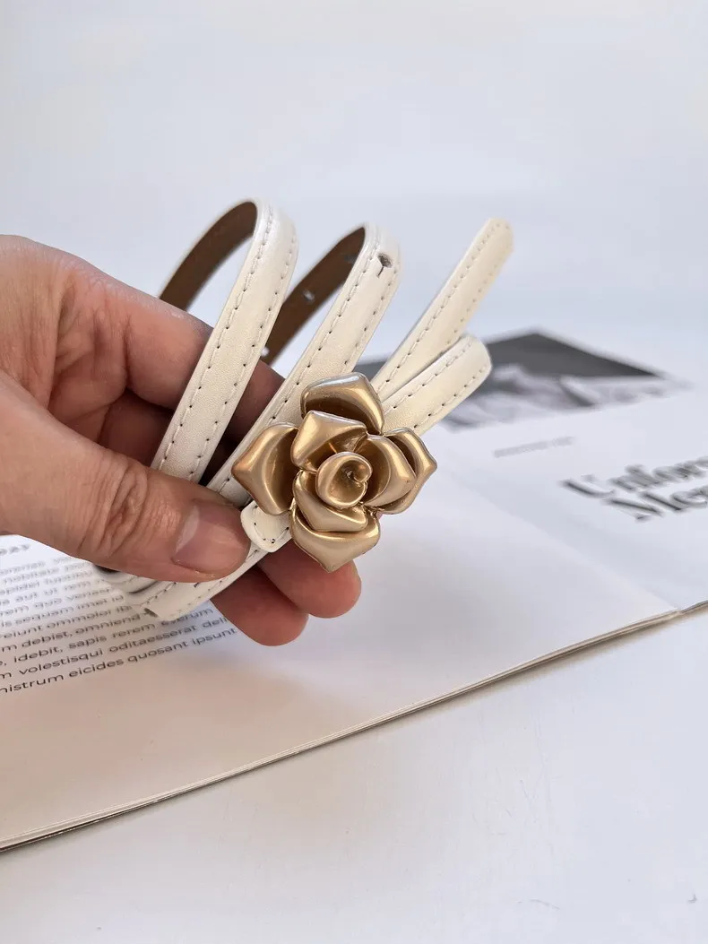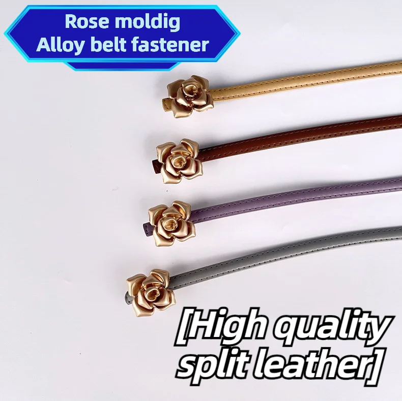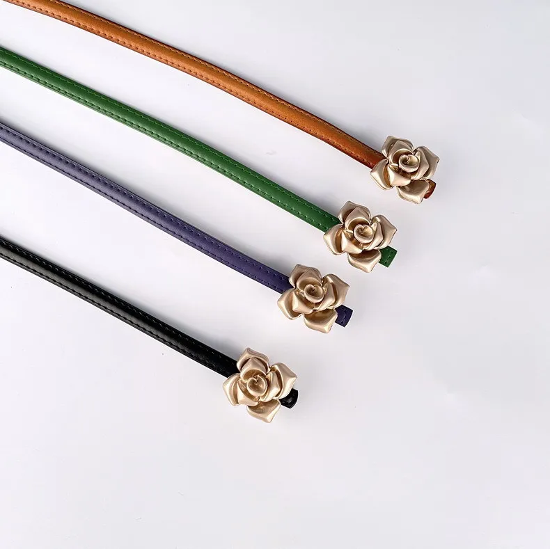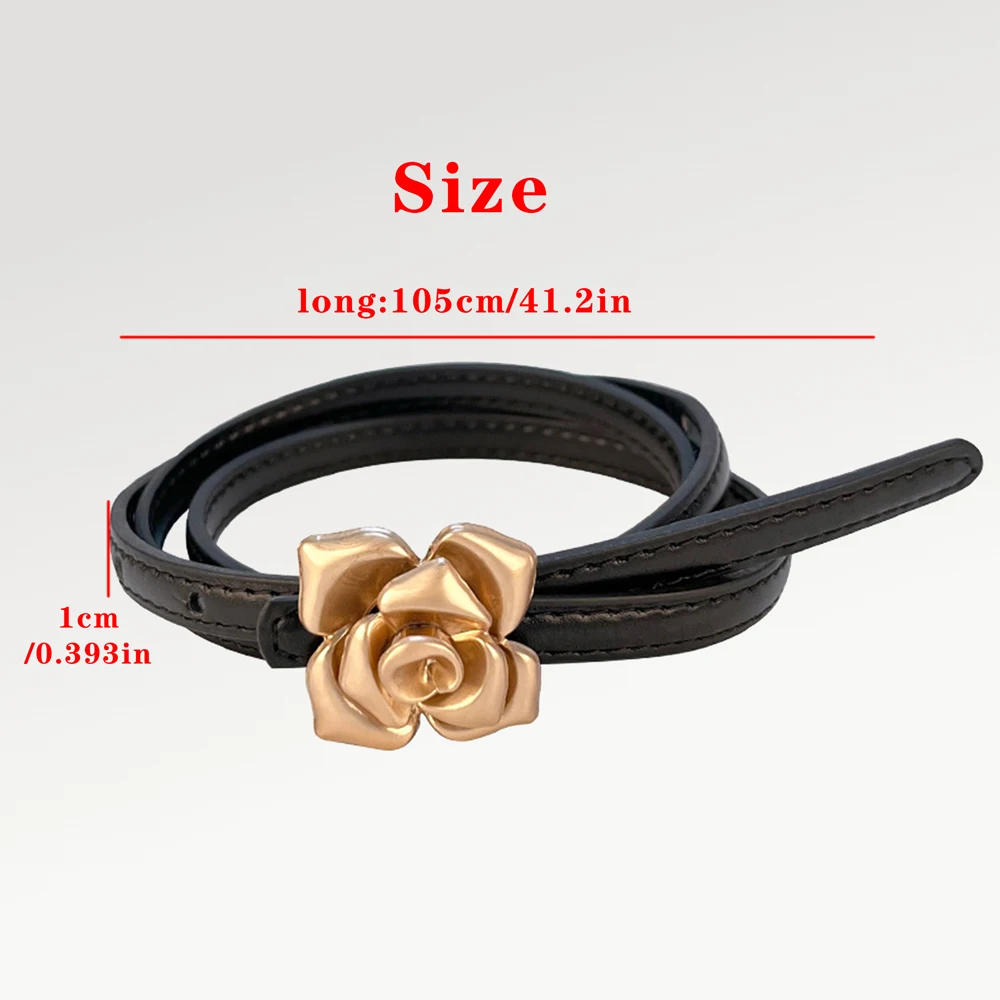 Color: black, Belt Length: 105CM - 1.0cm New Unique Rose Genuine Leather Gold Belt Women Fashion Cowskin Flower Thin Belts Female Jeans Dress Waistband