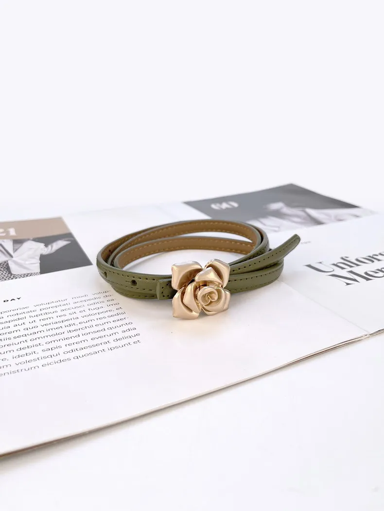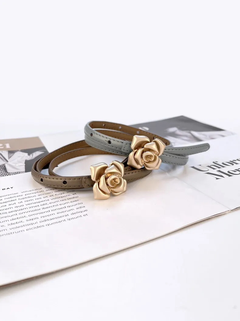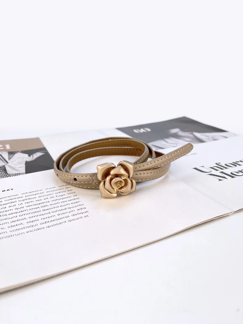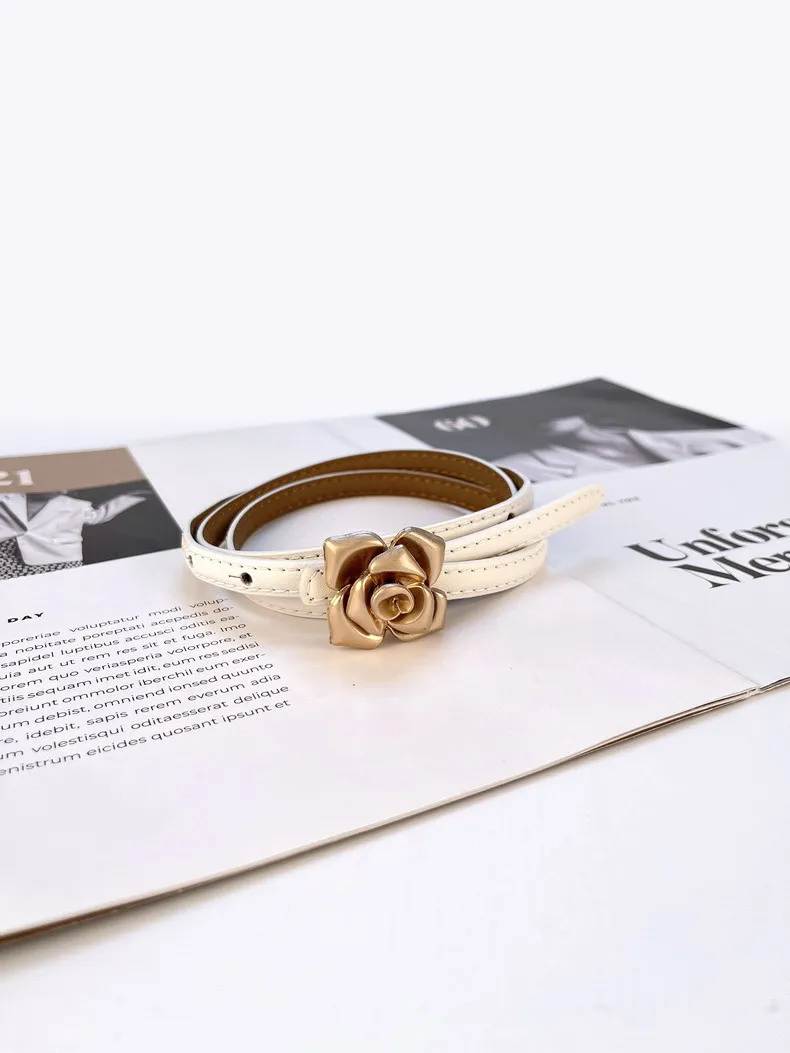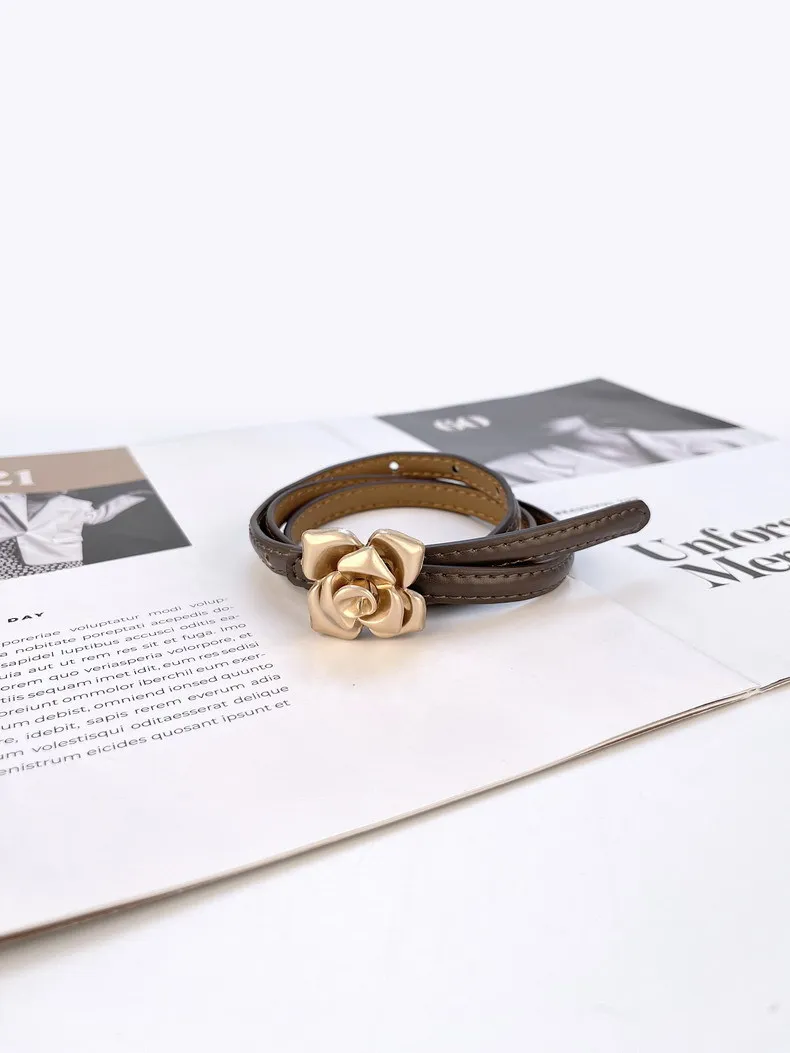 Color: black, Belt Length: 105CM - 1.0cm New Unique Rose Genuine Leather Gold Belt Women Fashion Cowskin Flower Thin Belts Female Jeans Dress Waistband