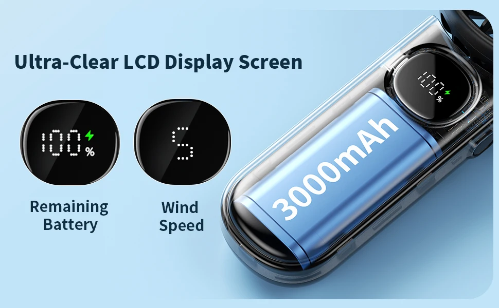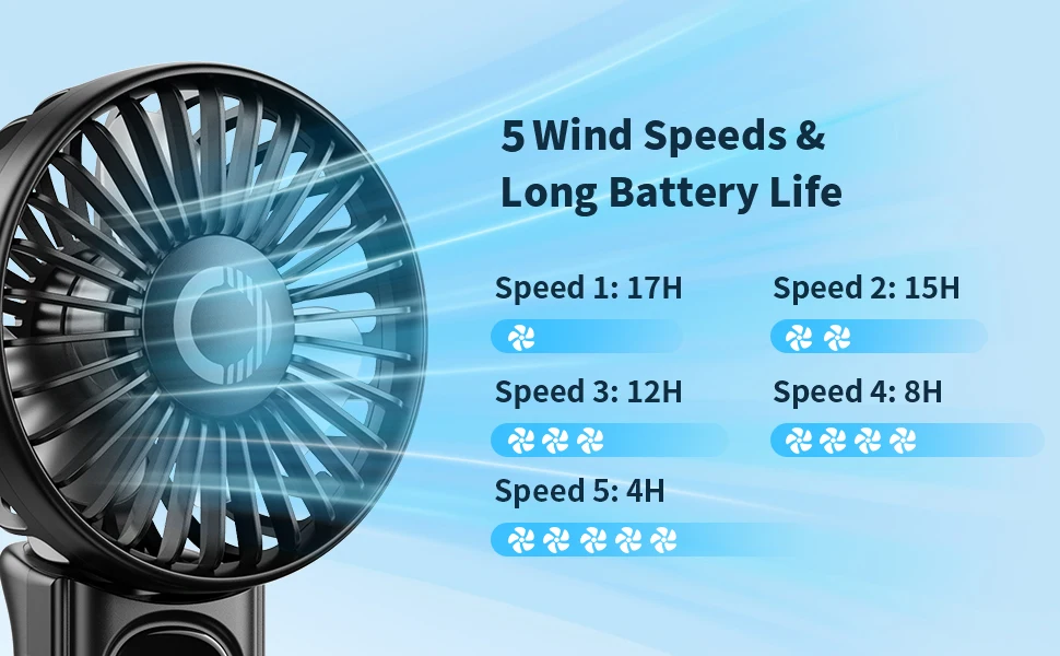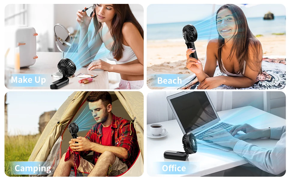 The battery powered fan has a built-in 3000mAh high-quality battery, which can be fully charged in just 2.5 hours and can run continuously for 4-17 hours. You can enjoy a cool and comfortable day without worrying about running out of power. Perfect for travel, makeup, eyelashes, camping, outdoor, indoor, etc