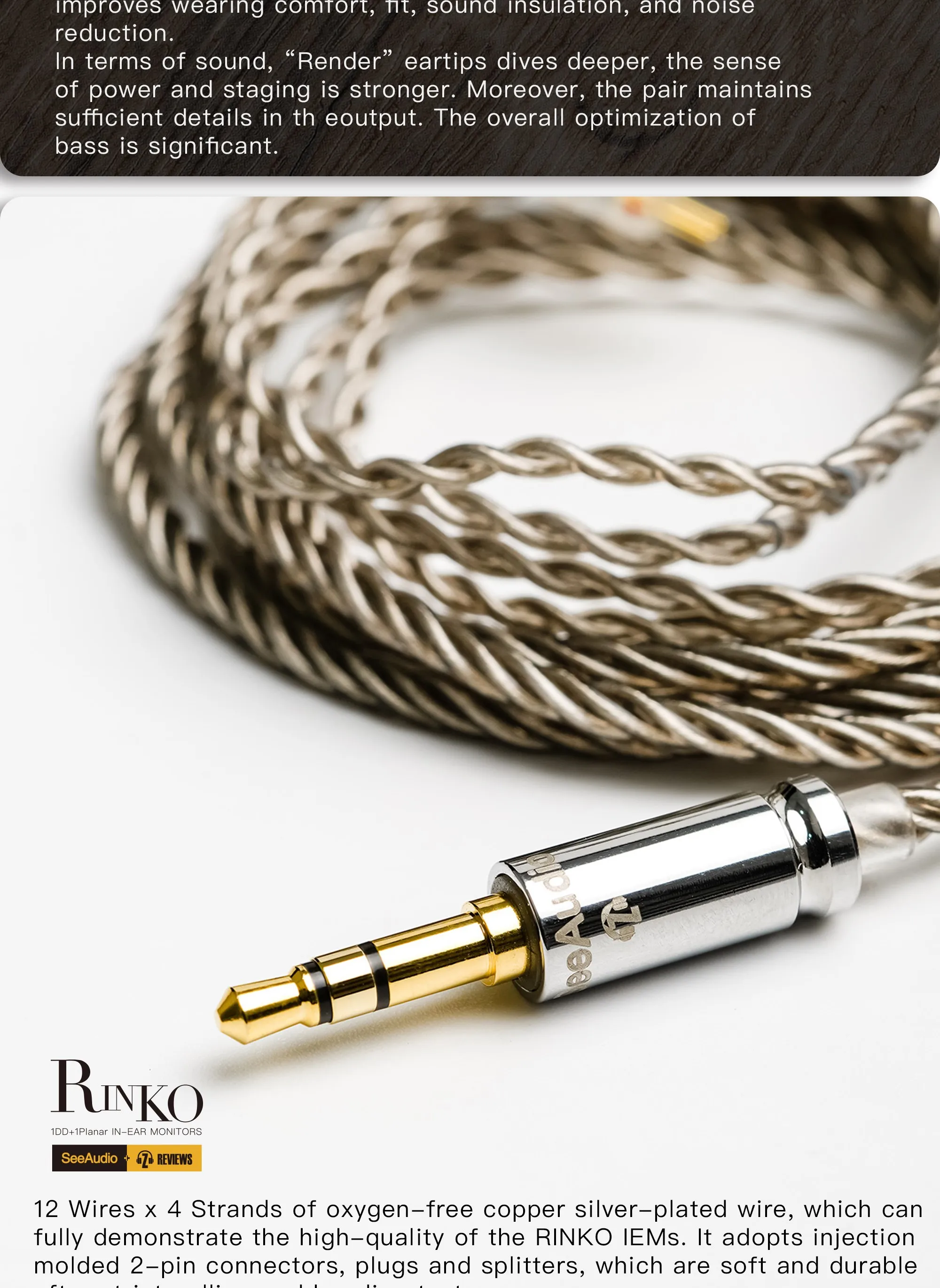 See Audio Rinko features a high-purity silver-plated oxygen-free copper stock cable. It’s a 4-strand grey twisted cable with silver-plated 6N oxygen-free copper wires. The cable has 2-pin connectors and a 3.5mm termination plug.