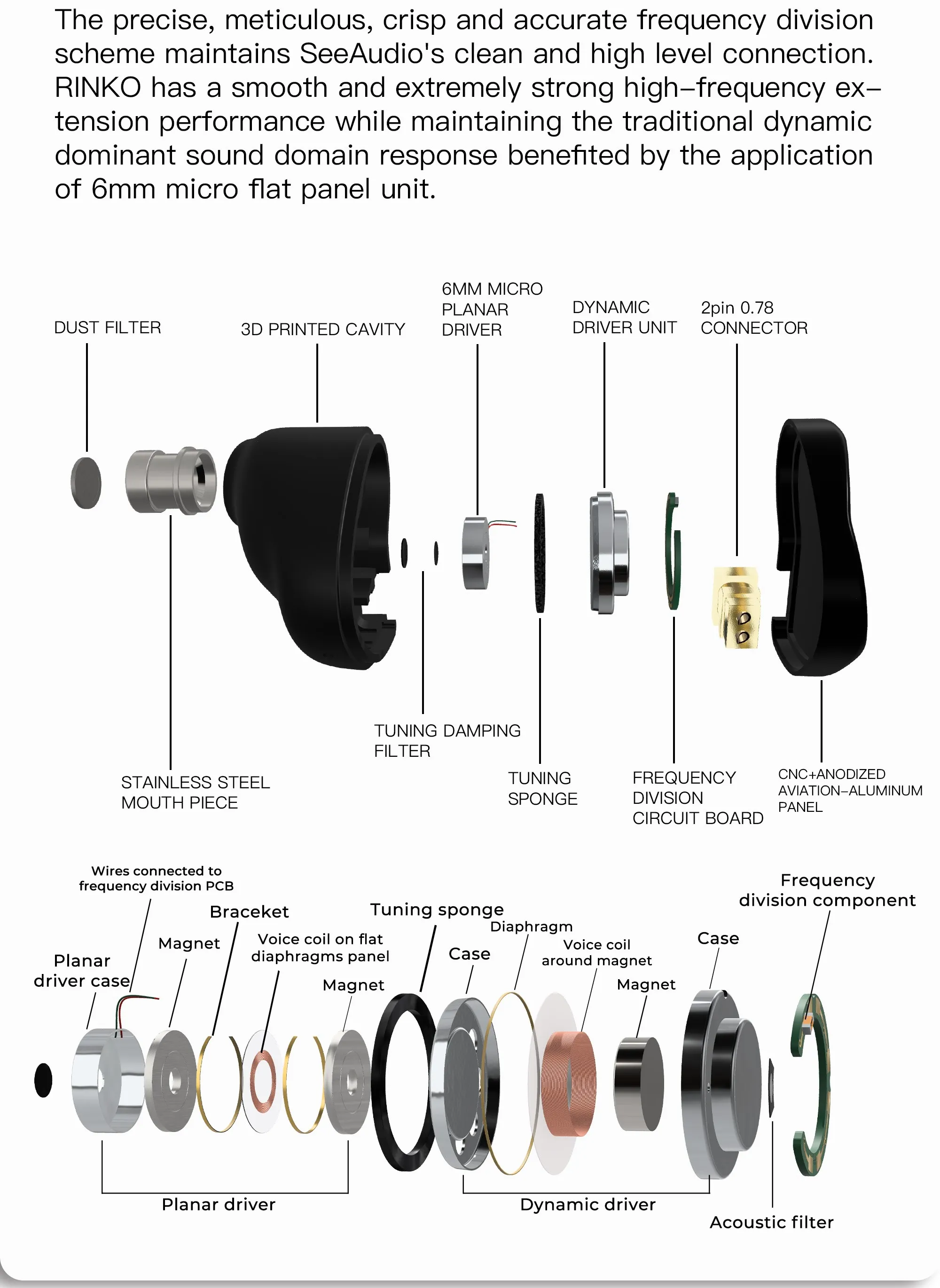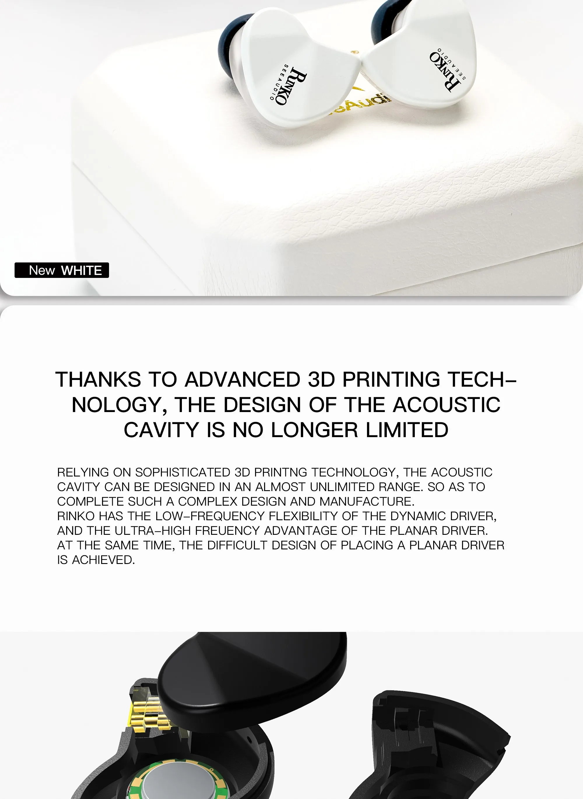 Rinko brings us the goodness of Planar and Dynamic Driver units in a single pair of IEMs. With a custom-developed dynamic driver unit, the pair is able to achieve deep-hitting lower end producing an impactful bass response. The Planar Driver implements the output with its extreme details, fast transients, and ultra-high-frequency extensions!!