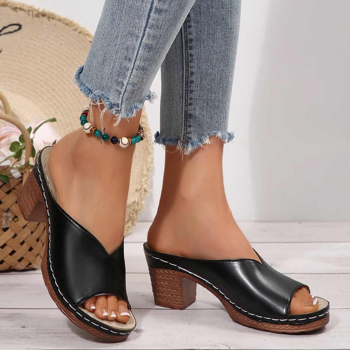 Color: black, Shoe Size: 37 - Women's Open-Toe High-Heel Slippers Summer New Fashion Outdoor Wear Slip-On Shoes 36-43 Sizes Polyurethane Upper Cushioning