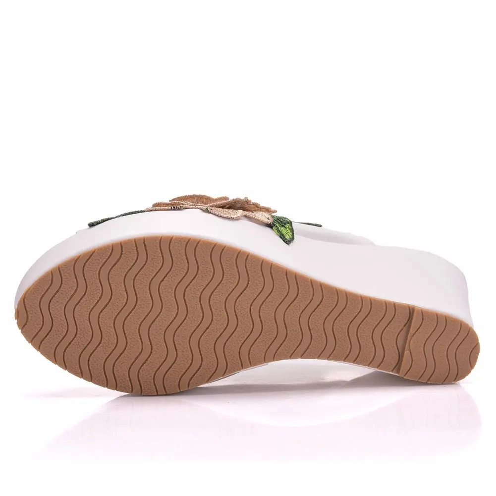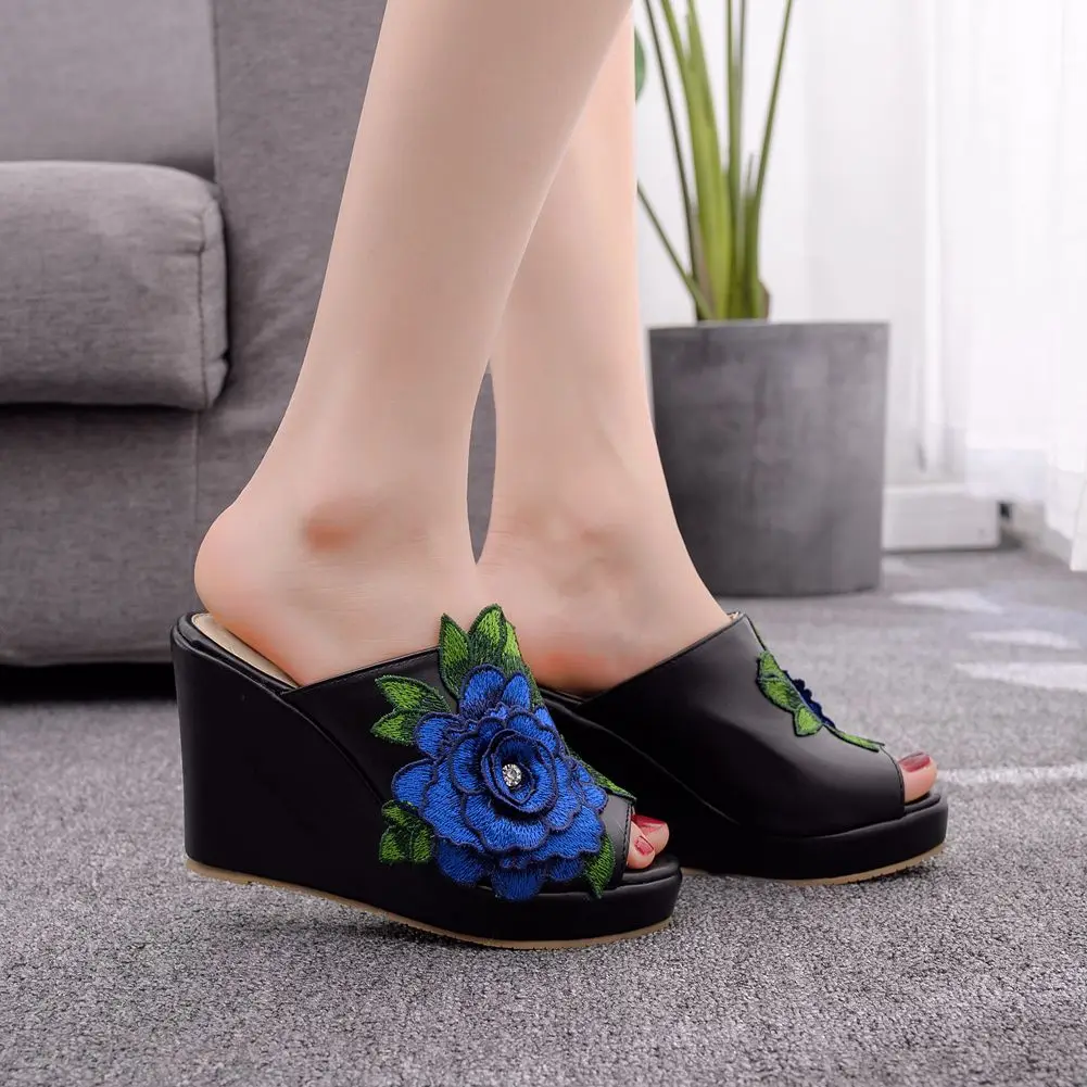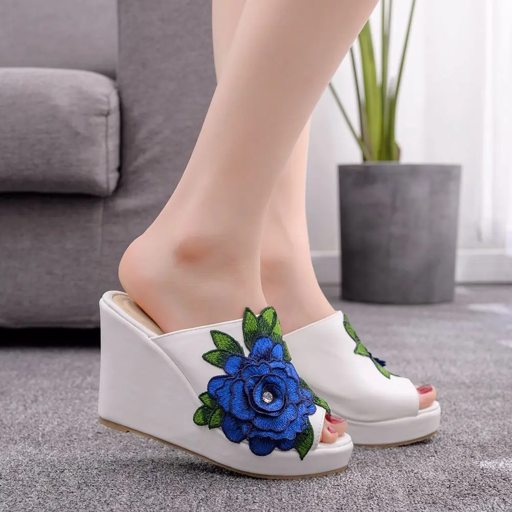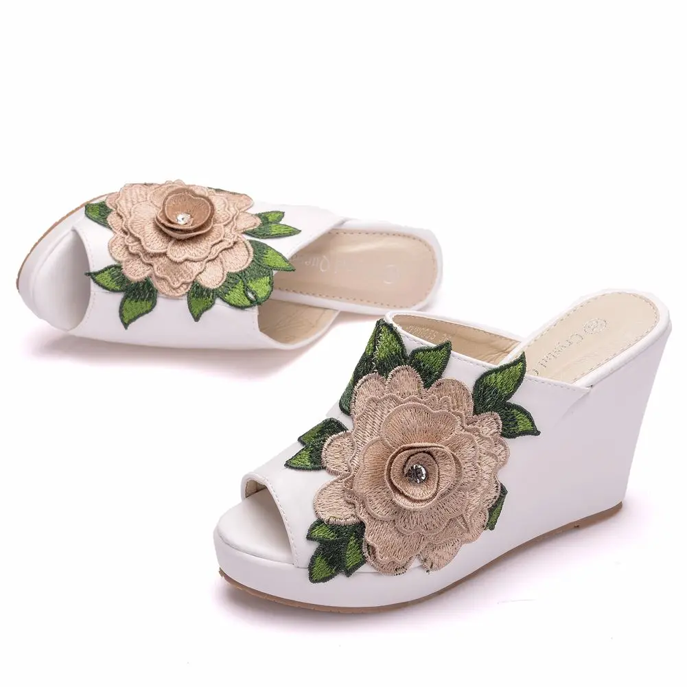 Color: black, Shoe Size: 39 - Crystal Queen Black White Peep Toe Platform Wedges High Heels Slippers Beach Sandals Women Lace Flower