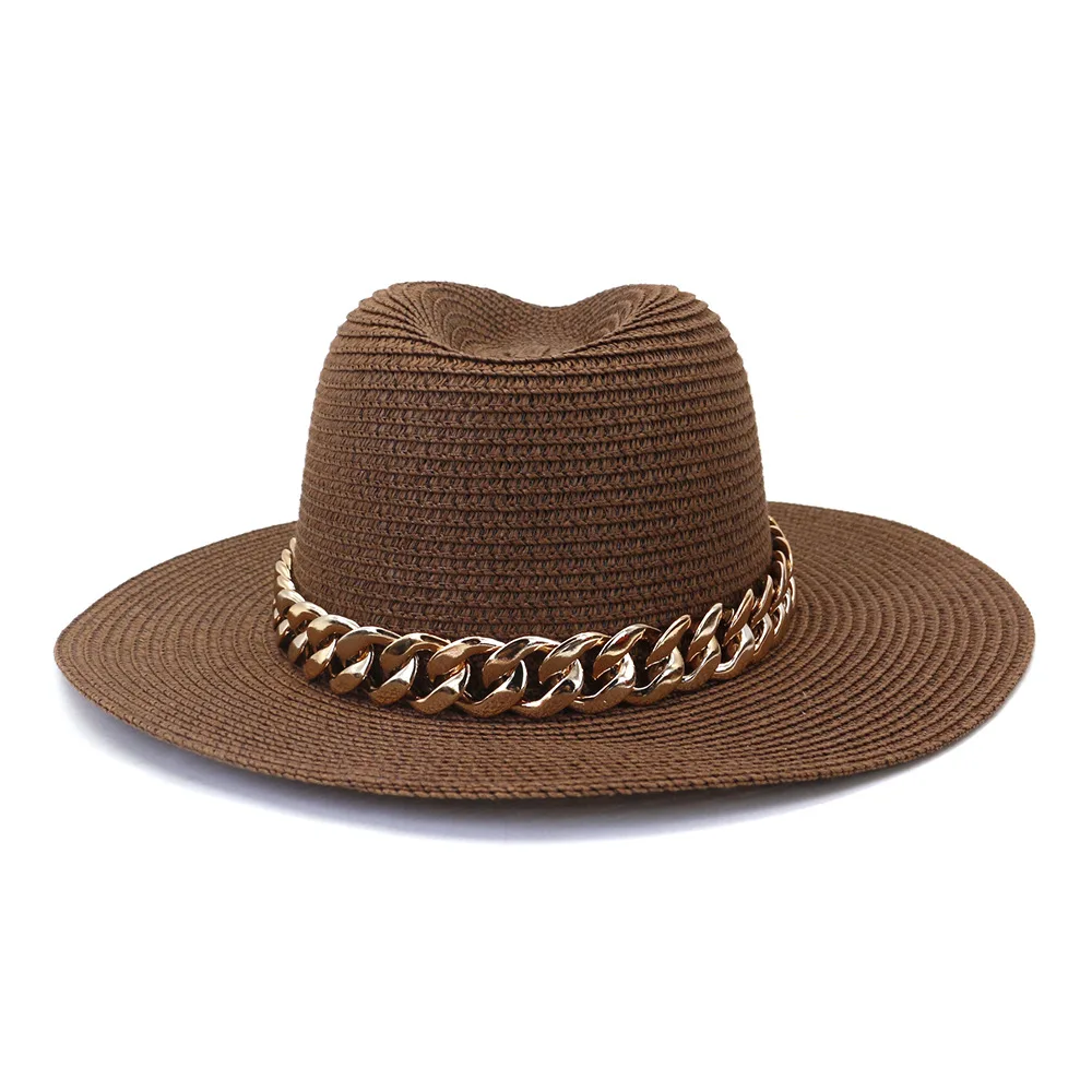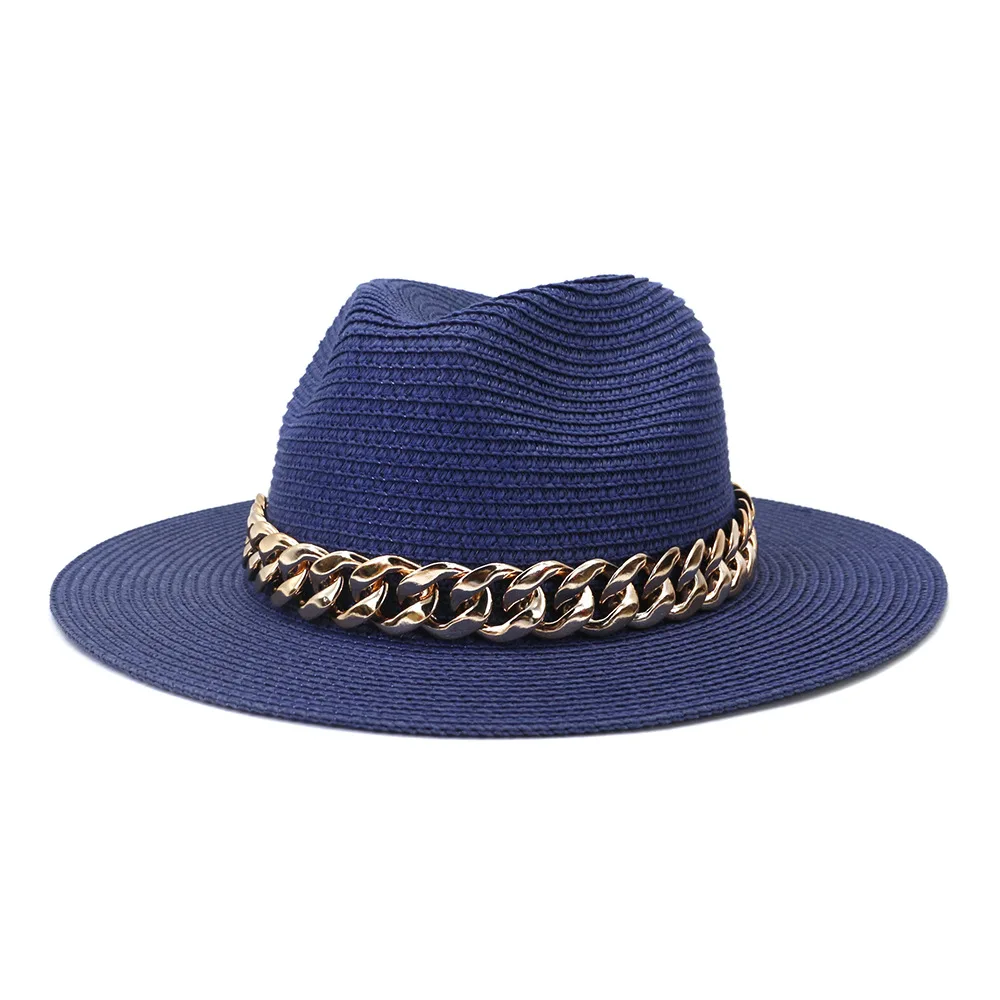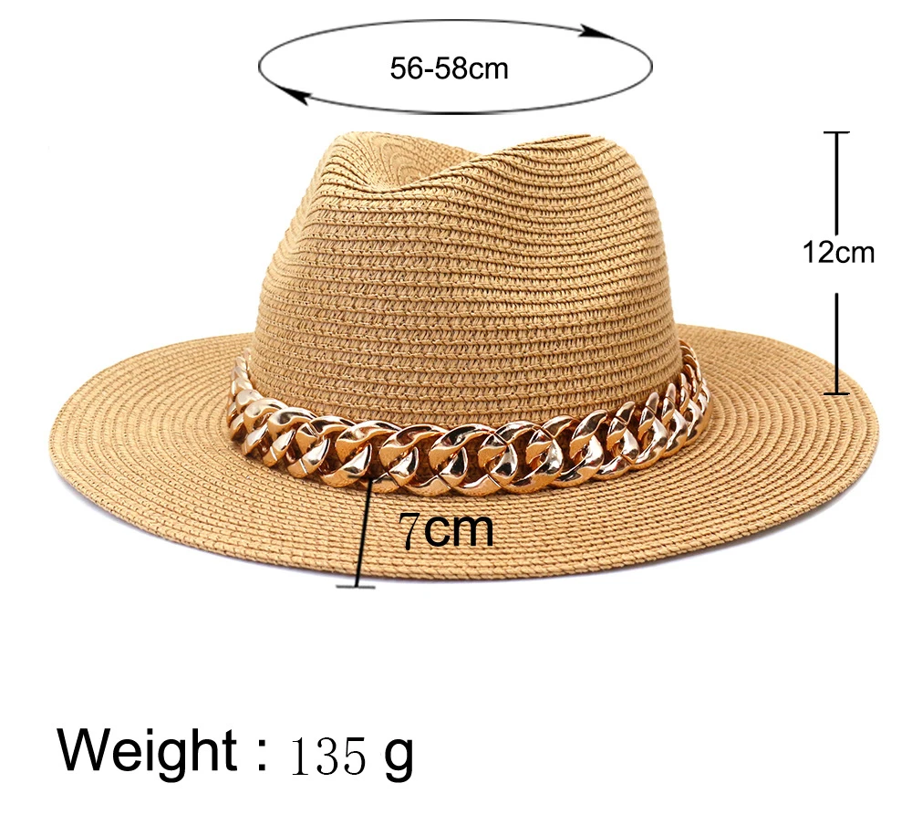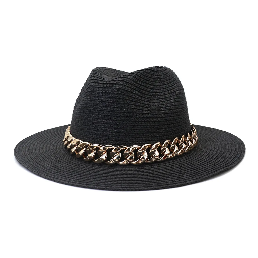 Color: black, Size: L - Fashion Gold Chain Belt Panama Straw Hats For Women Summer Breathable Beach Sun Hats Elegant Ladies Party Jazz Hat