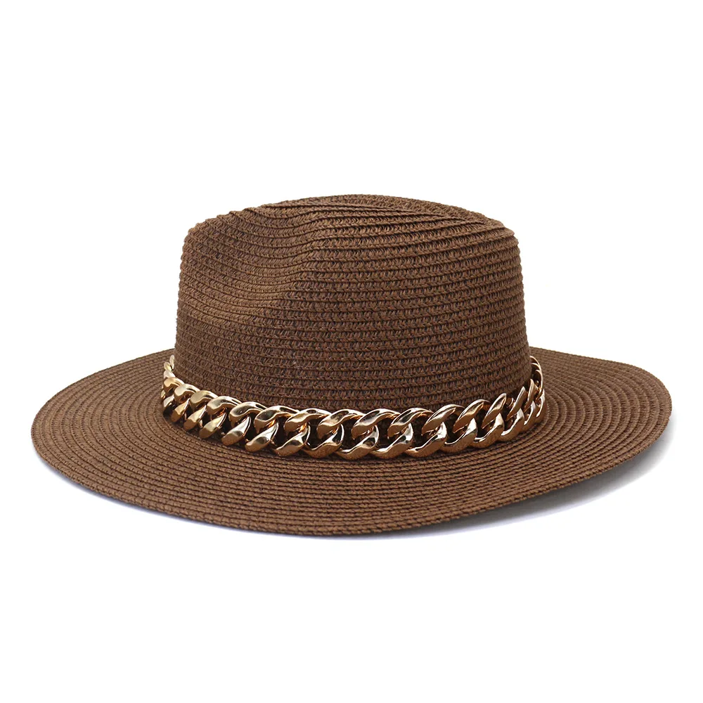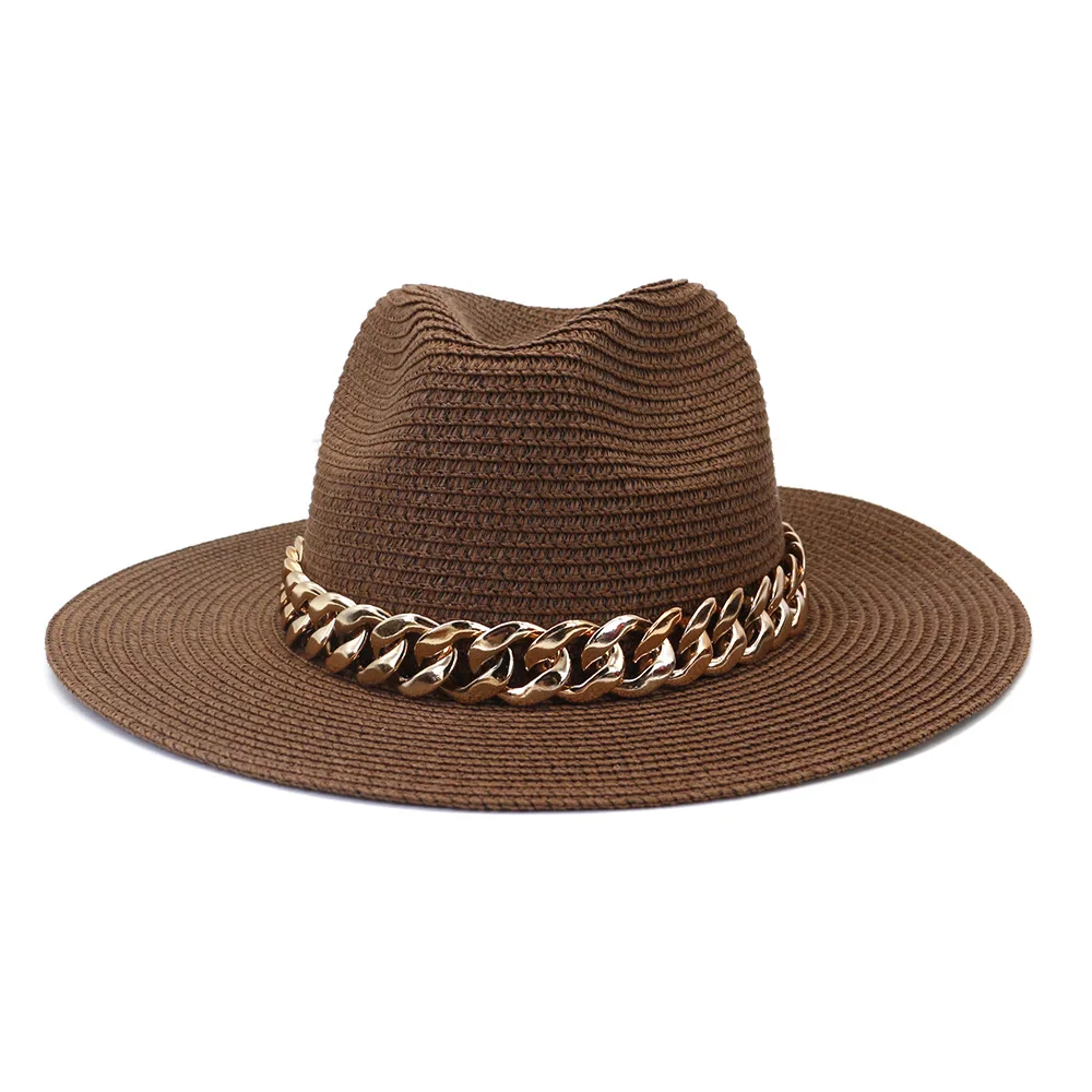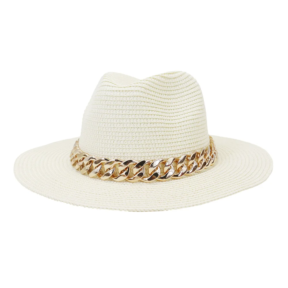 Color: black, Size: L - Fashion Gold Chain Belt Panama Straw Hats For Women Summer Breathable Beach Sun Hats Elegant Ladies Party Jazz Hat