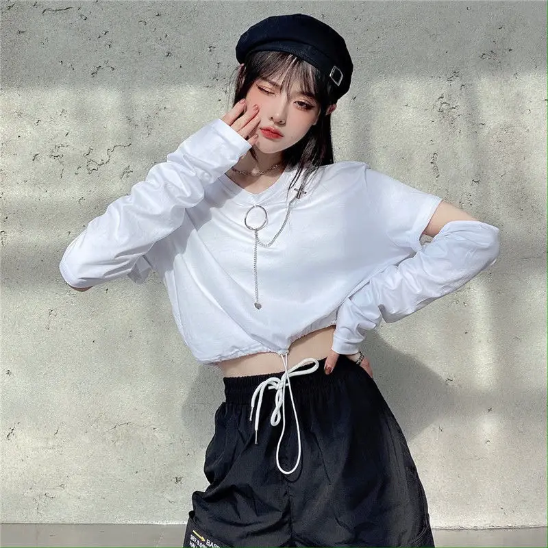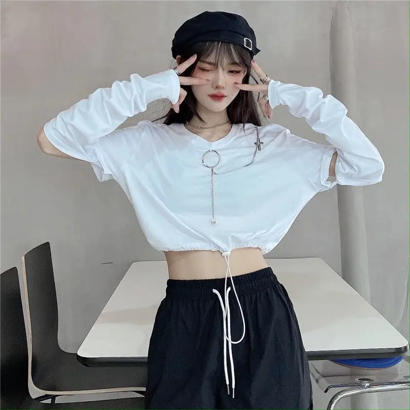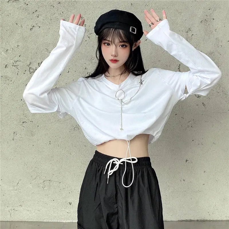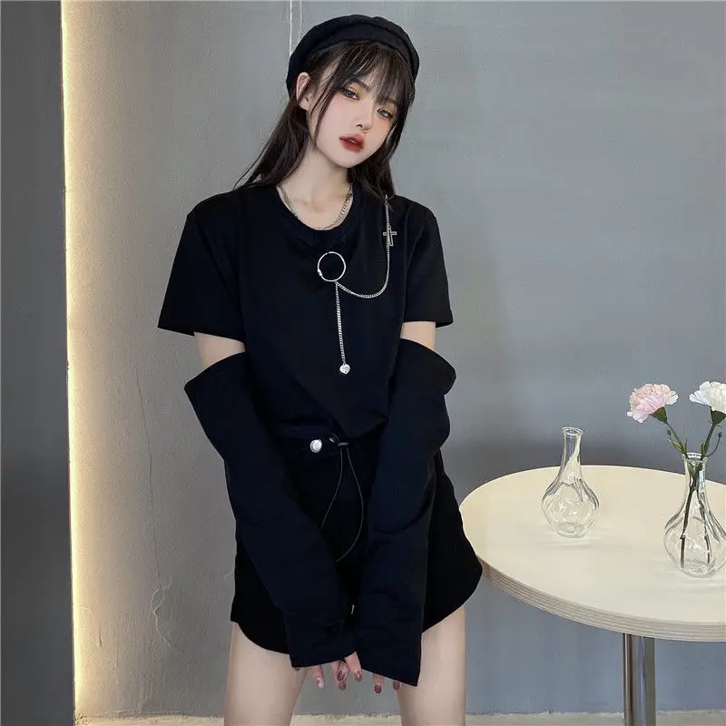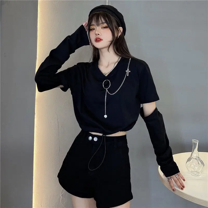 Color: black, Size: L - Solid T-shirts Women Removable Sleeve Sequined Chain Japanese Style Harajuku Trendy Goth Y2k Female Crop Top Hot Sale Popular
