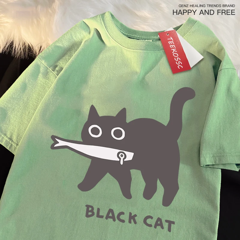 Color: black, Size: S - Fun A Black Cat Eating Fish Japanese Style Men Women T-Shirt Fashion Print T Shirt Breathable Oversize T-Shirts Cotton Clothes
