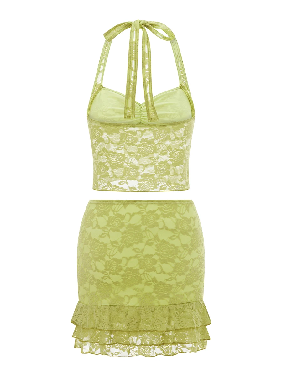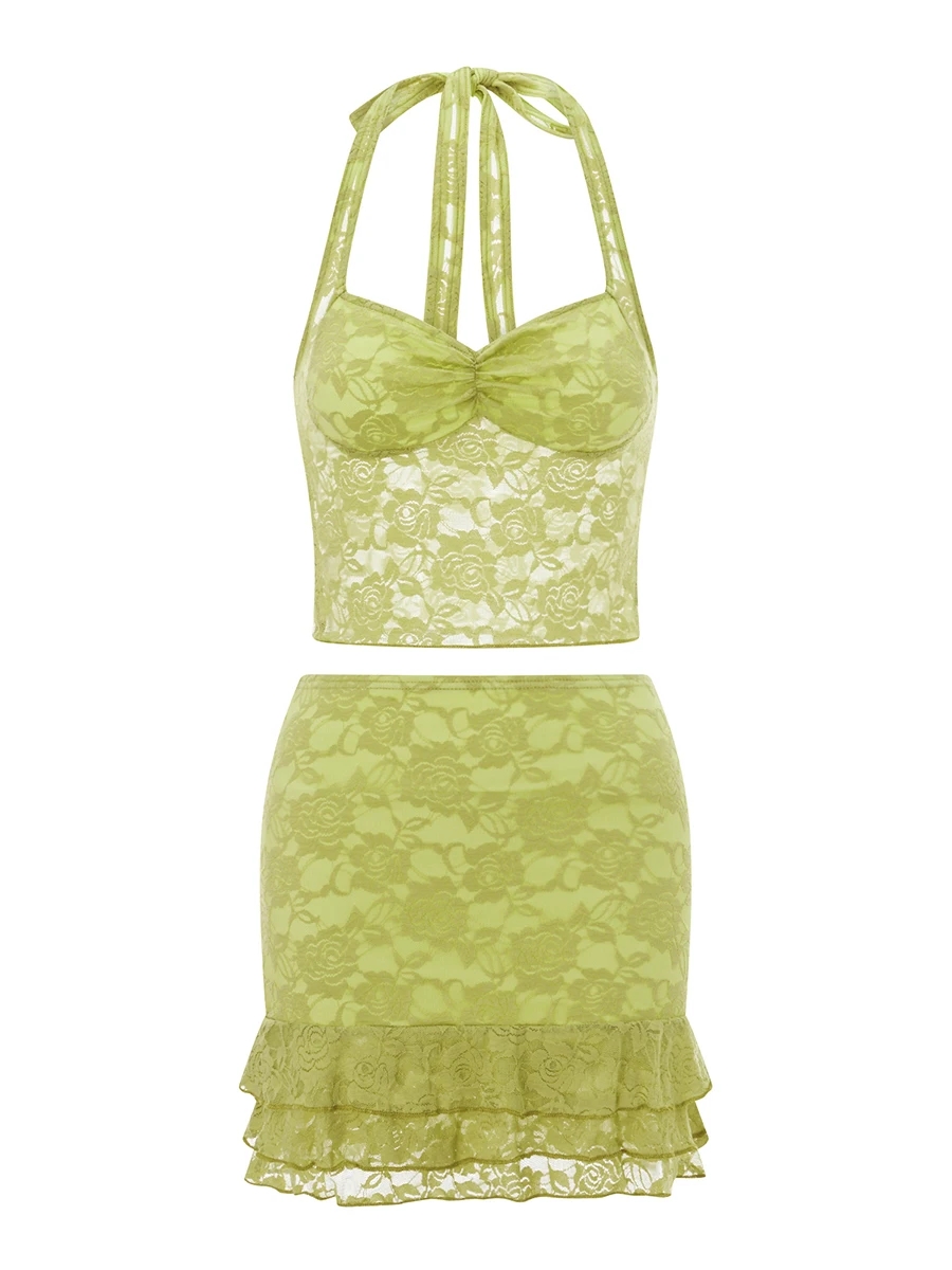 Women Summer Skirts Outfits Tie-Up Halter Neck Sleeveless Backless Lace Tank Tops Mini Skirts 2 Pieces Clothes Set