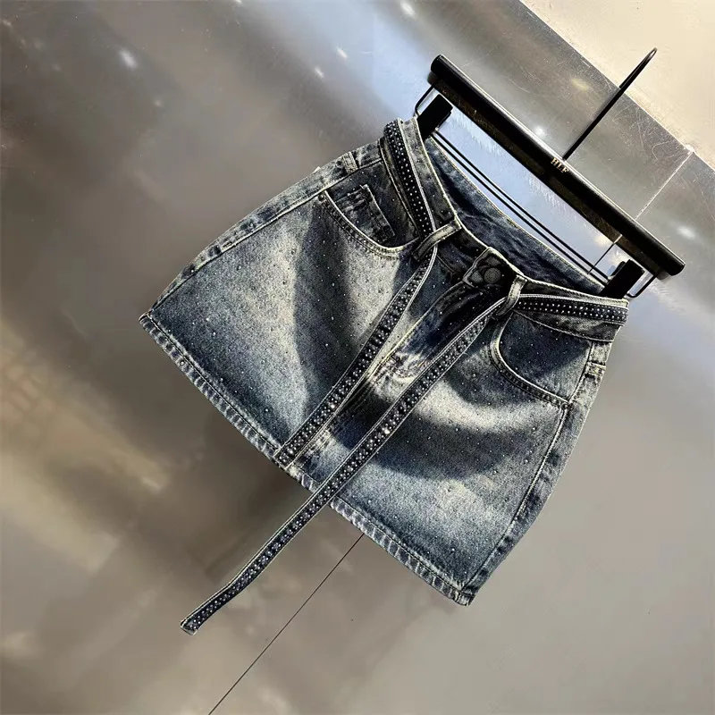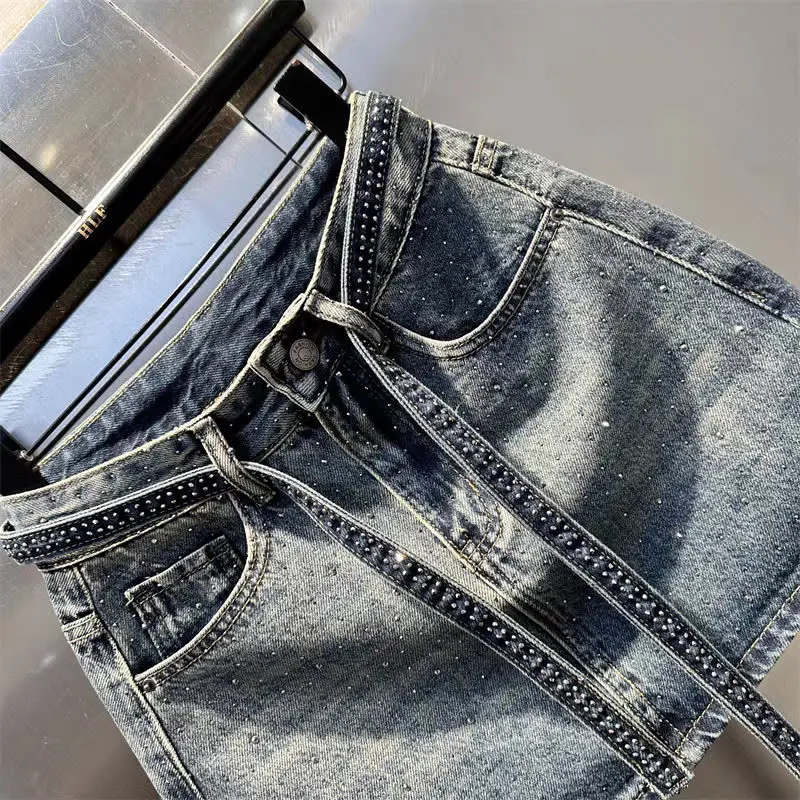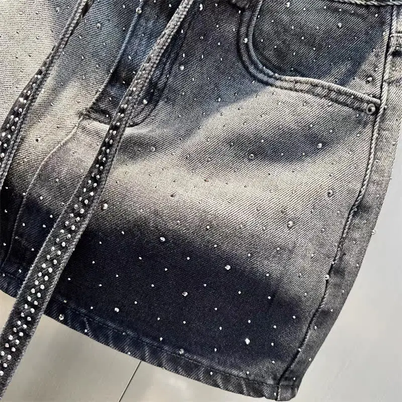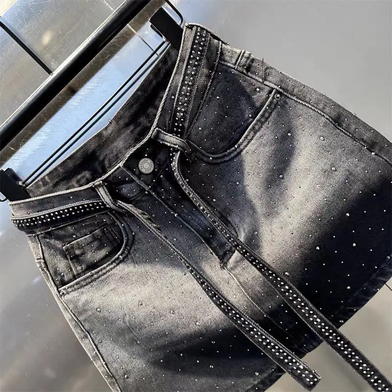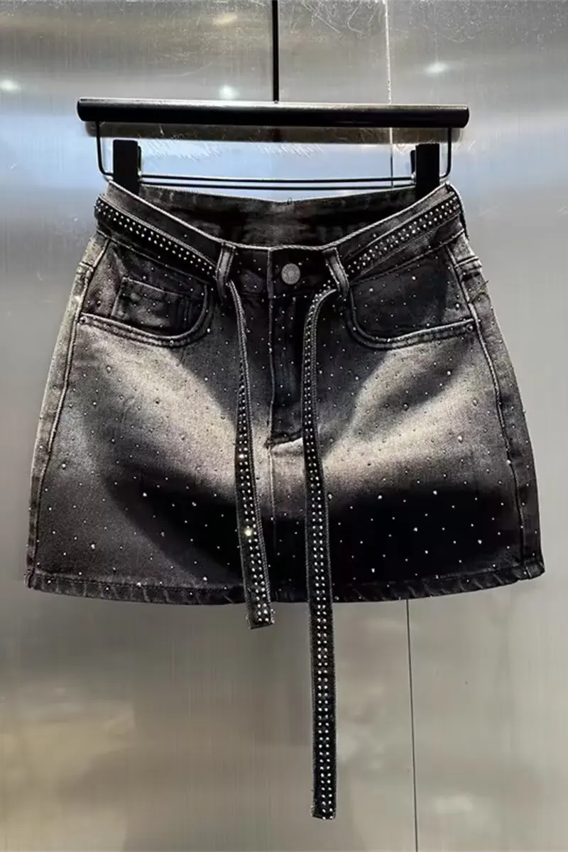 Color: black, Size: XXXL - Oversize Retro Diamond Denim Mini Skirt for Women Summer High Waist Shiny Rivet Slim Skirts Gradient Black Grey Jean Skirts