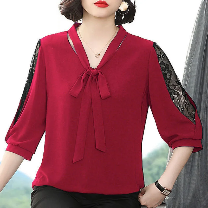 Color: black, Size: XXXL - Women Spring Summer Style Blouses Tops Lady Casual Bow Tie Colloar Half Lace Sleeve Loose Blusas Tops DF4275
