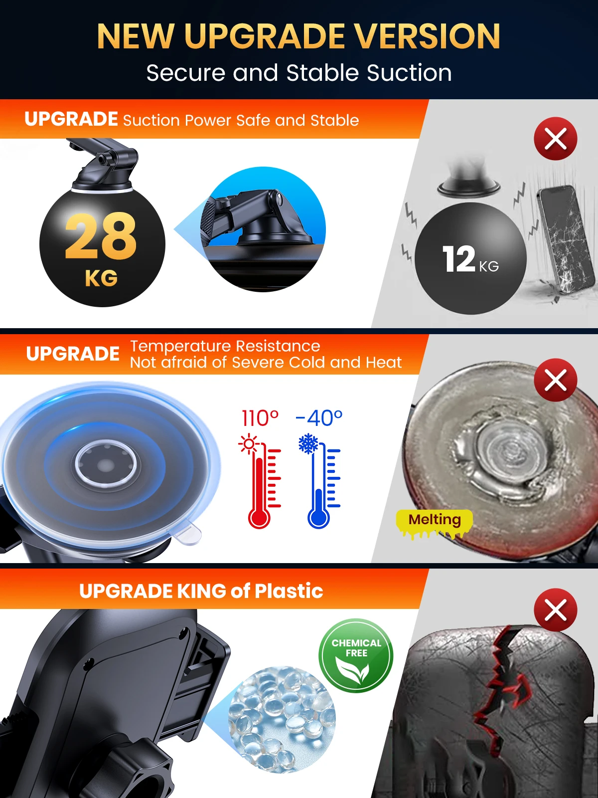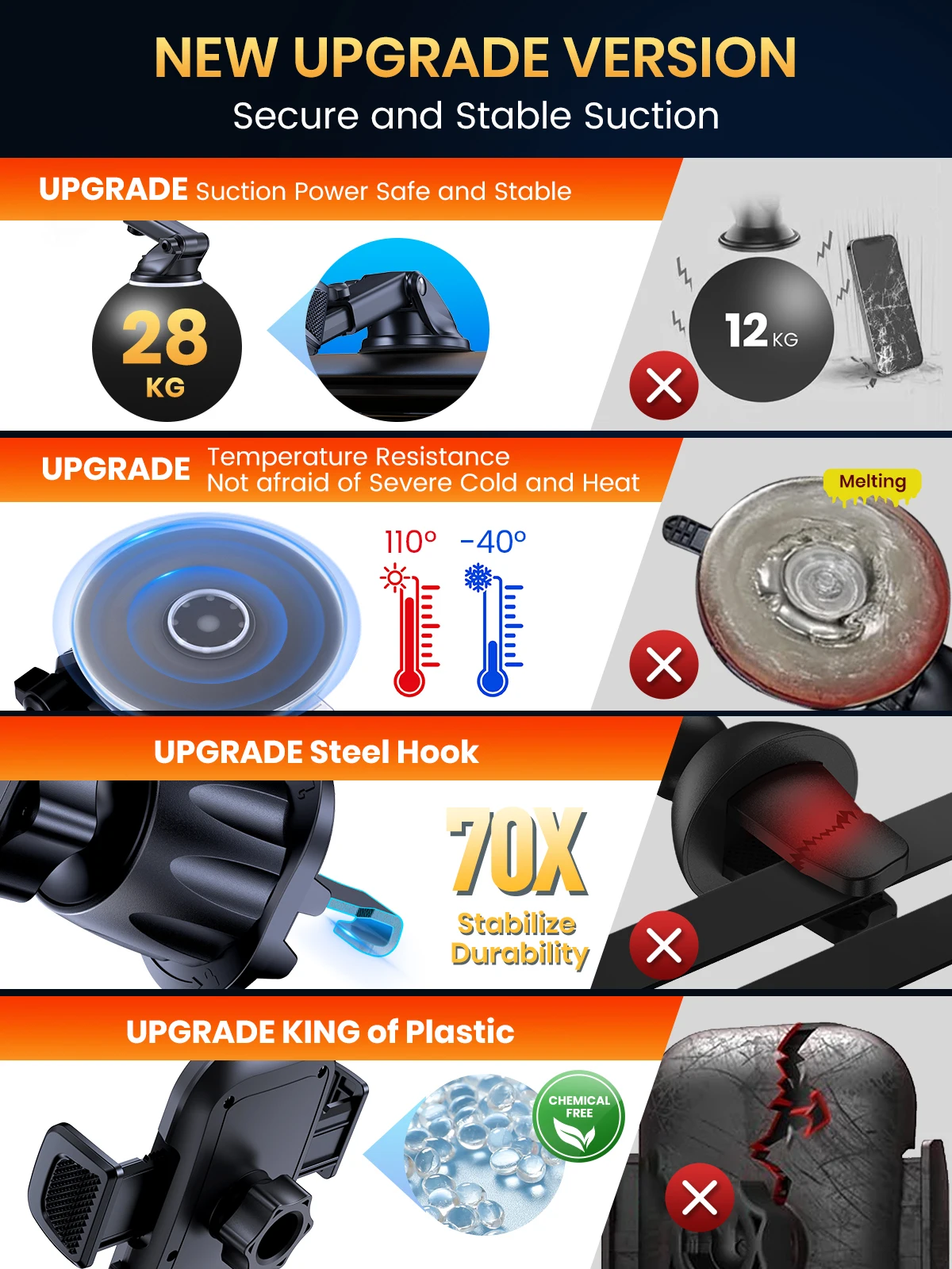 [Multifunctional Design] The car phone holder can be firmly attached to the air vents, dashboard, windscreen, desk. All places work perfectly, giving you more options during installation. Whichever way you choose to mount it, the holder will support your phone securely.