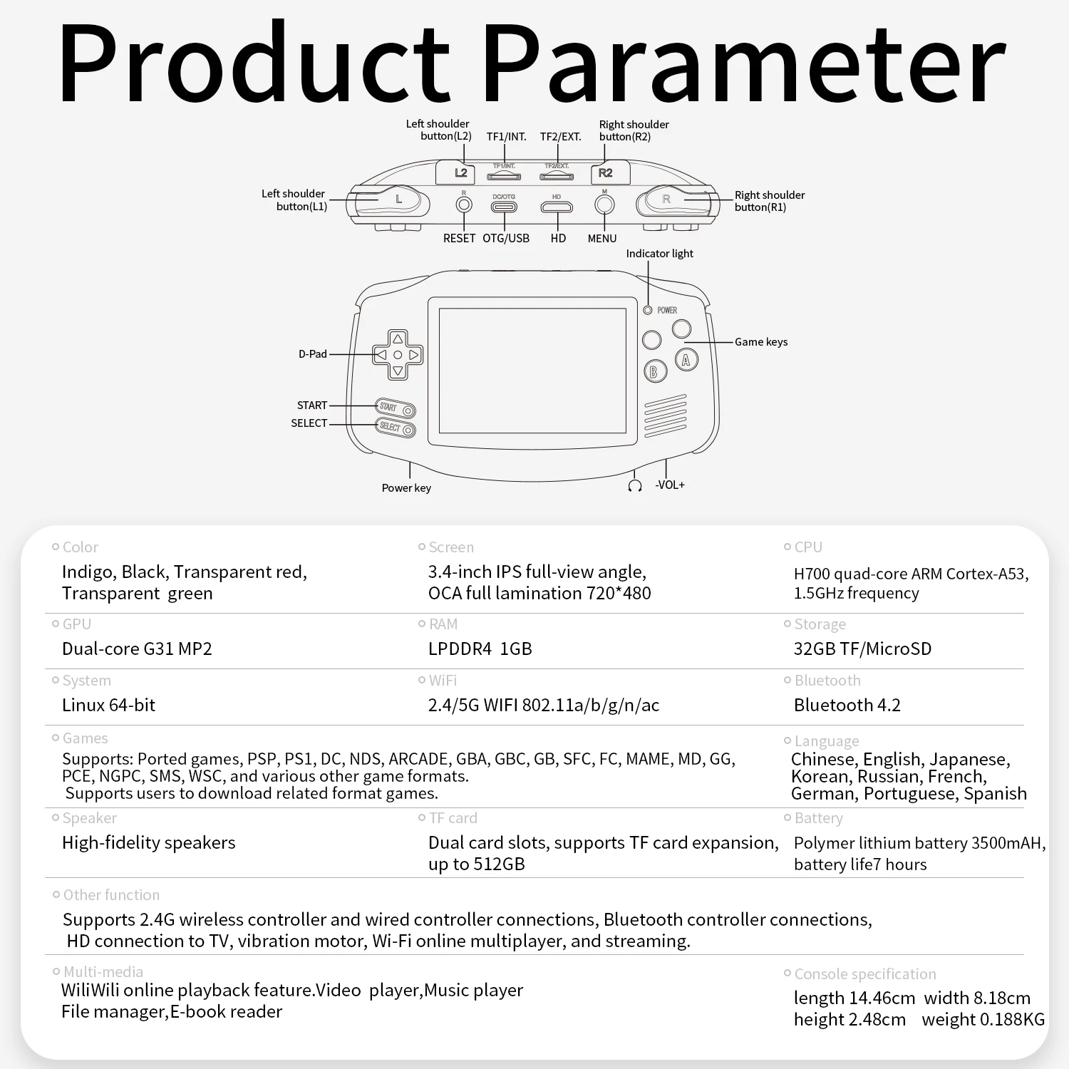 Multifunctional RG34XX Supports 5G WIFI Bluetooth 4.2,Video player,Music player,file manager, and e-book reader,Supports 2.4G wireless controller and wired controller connection, bluetooth controller connections,connect to your TV through the HD output and enjoy gaming on the big screen, vibration motor, WIFI online multiplayer, streaming etc, providing endless options for personalized gaming experiences.