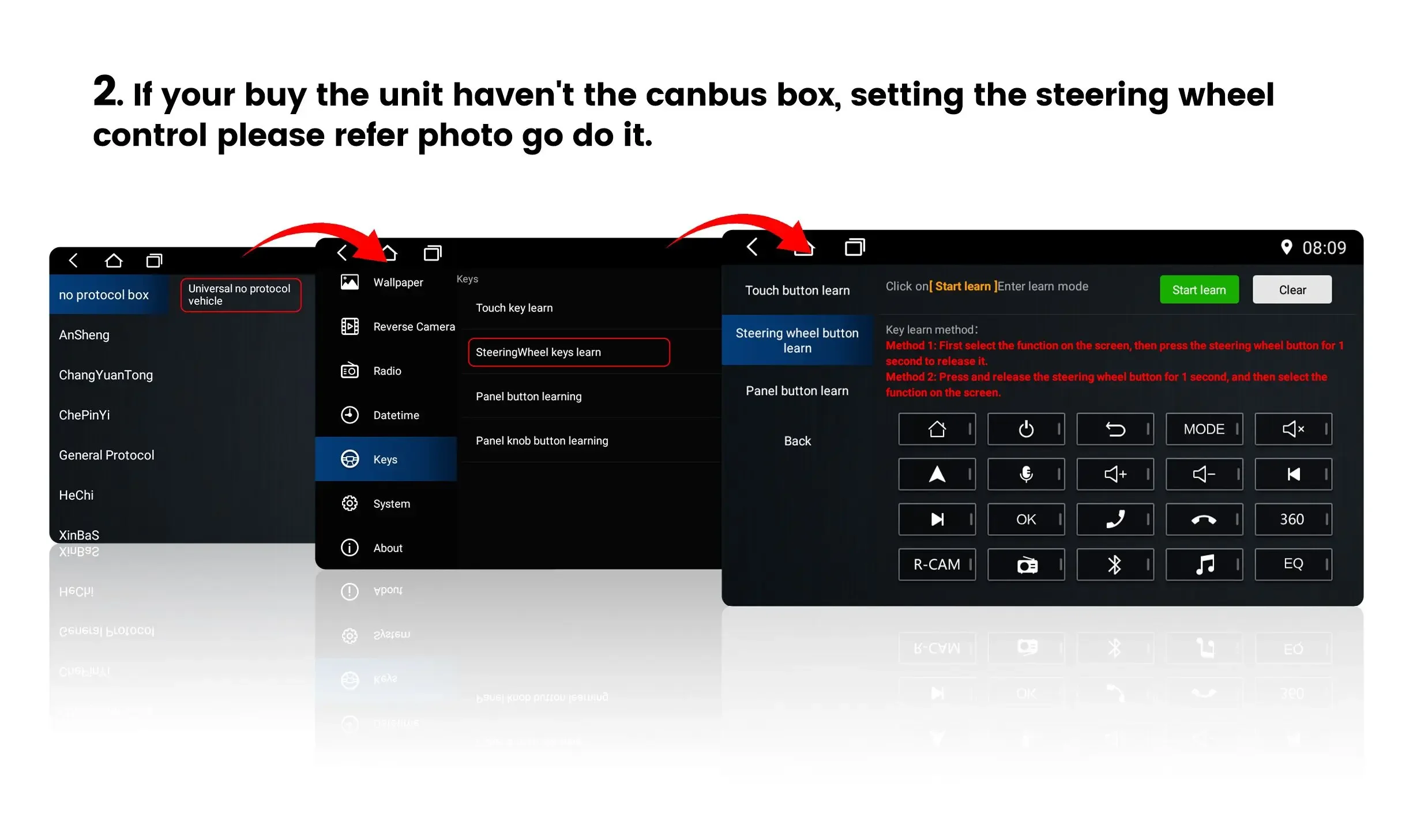 Please note!If the product contains CANBUS, if the steering wheel control does not work, please check whether the operations in the picture below have been performed. If you encounter any questions, please leave us a message in time.Thank you!