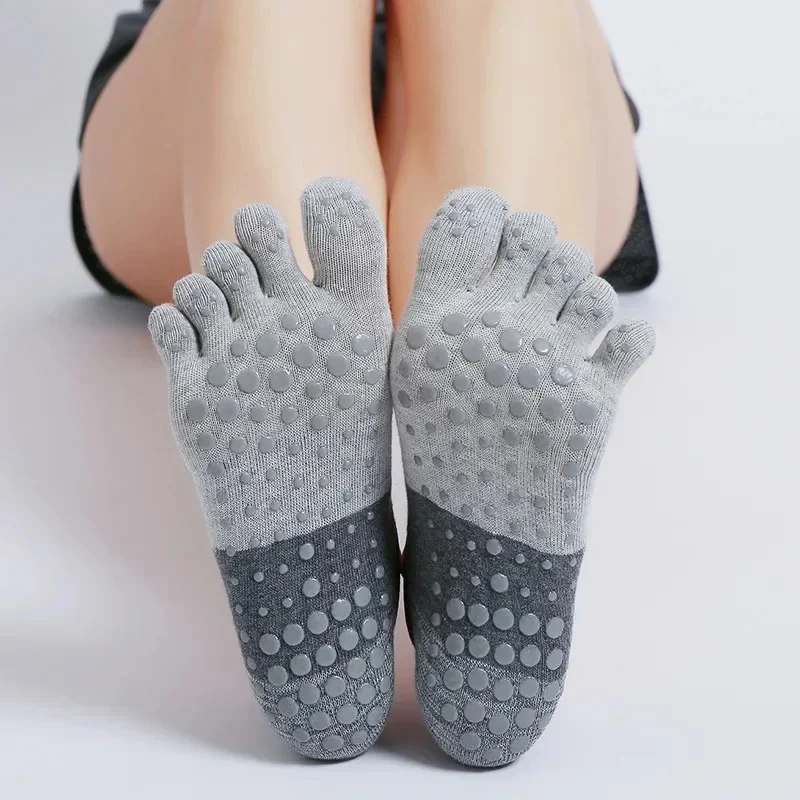 Color: Blue - Ladies Breathable Yoga Socks Silicone Non-Slip Five Finger Pilates Socks for Backless Fitness Ballet Dance Cotton Gym Socks