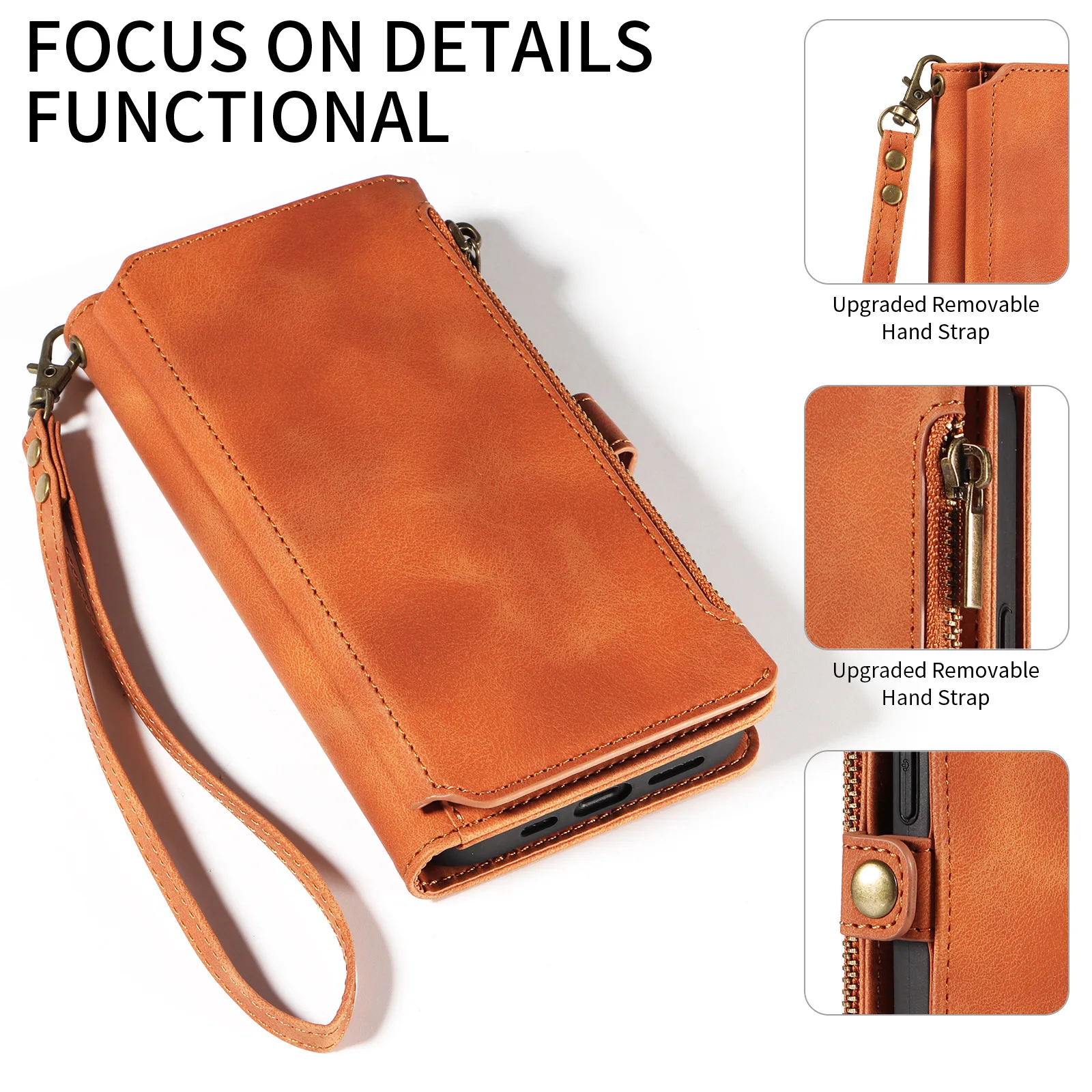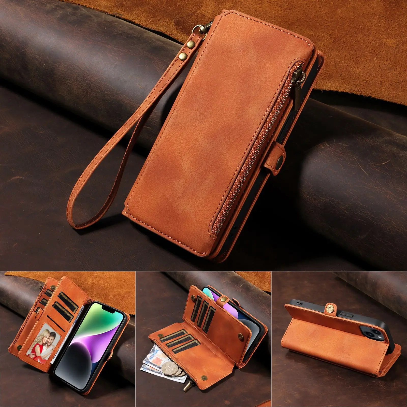Zipper Multi 9 Cards Wallet Case for OPPO Reno 12 10 8 7 6 5 Pro 11F 11A 8T 6Z 5Z Retro Leather Lanyard Wrist Strap Phone Cover