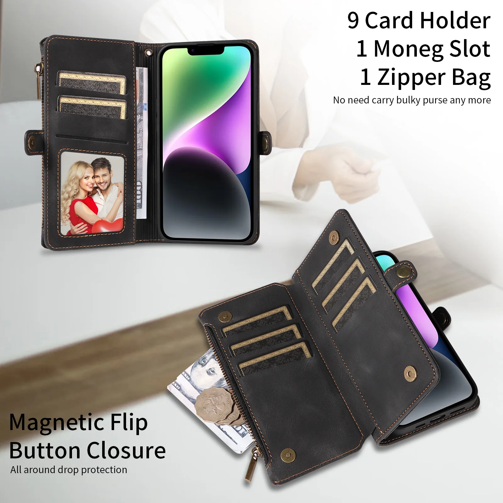 Feature 1: Zipper Wallet / flip case with 9 card slots + 1 cash slot+Zipper Pocket