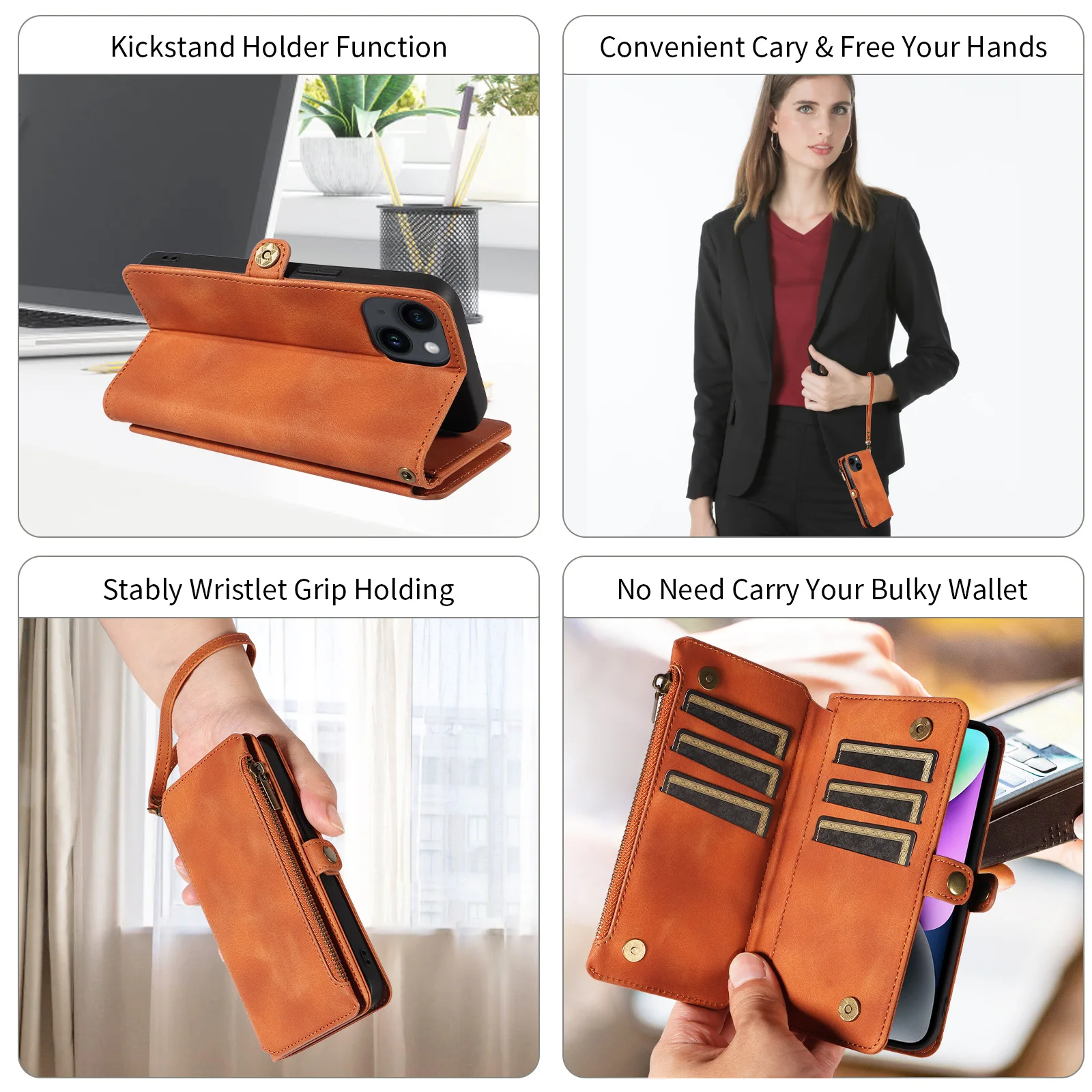 Zipper Multi 9 Cards Wallet Case for OPPO Reno 12 10 8 7 6 5 Pro 11F 11A 8T 6Z 5Z Retro Leather Lanyard Wrist Strap Phone Cover