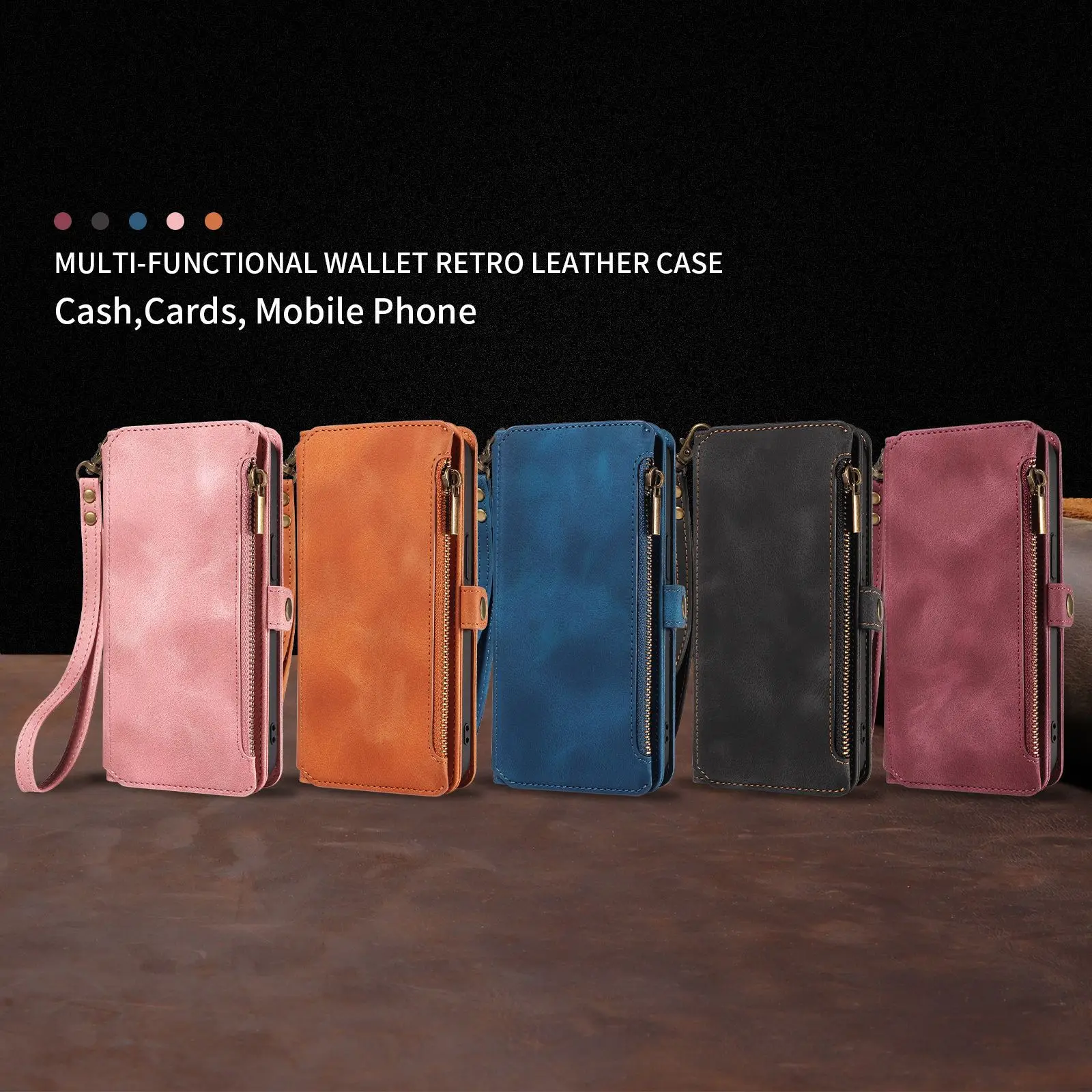 Zipper Multi 9 Cards Wallet Case for OPPO Reno 12 10 8 7 6 5 Pro 11F 11A 8T 6Z 5Z Retro Leather Lanyard Wrist Strap Phone Cover