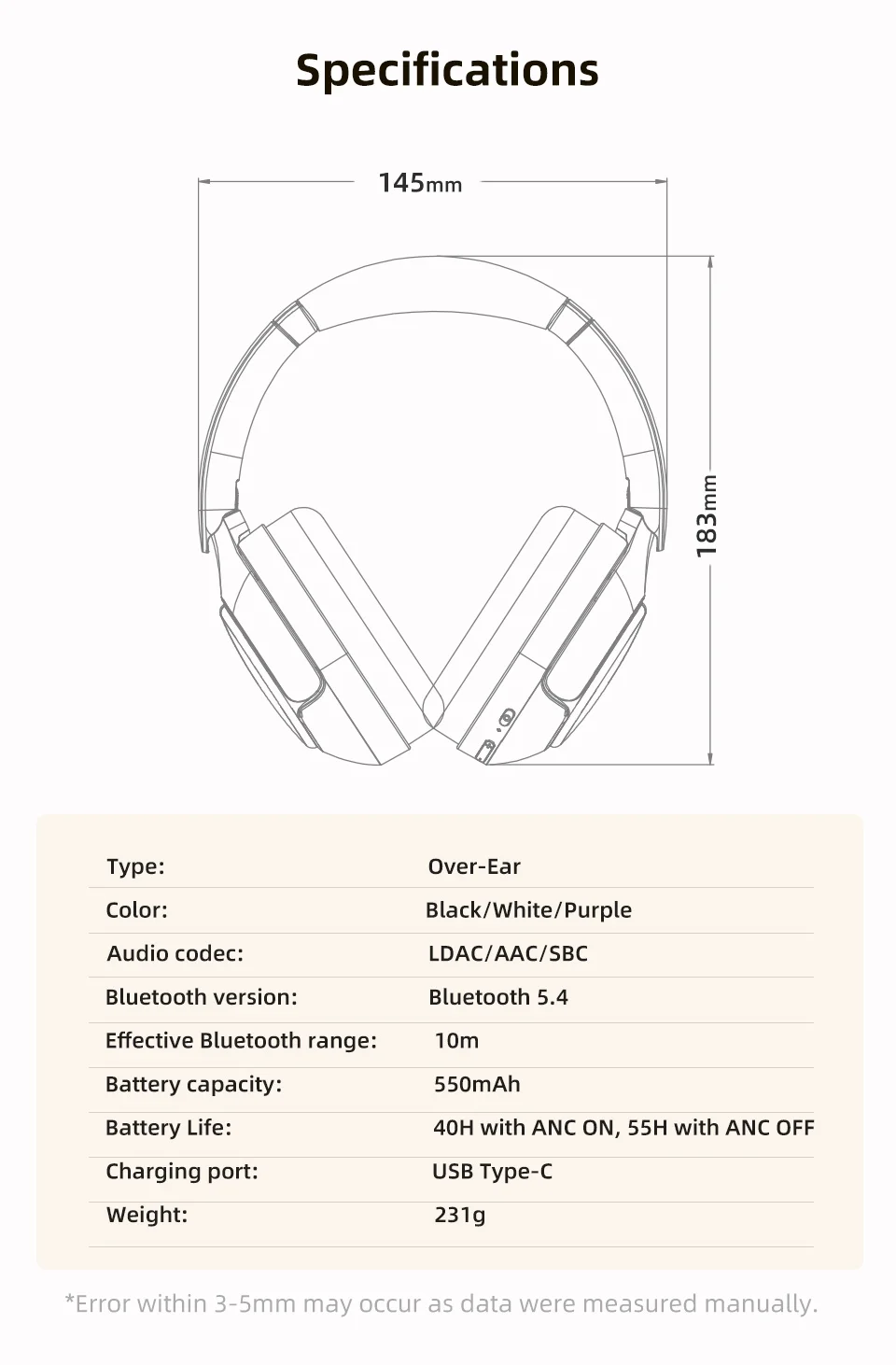 Music play time: 40h with ANC ON, 55h with ANC OFF