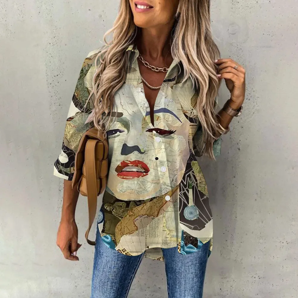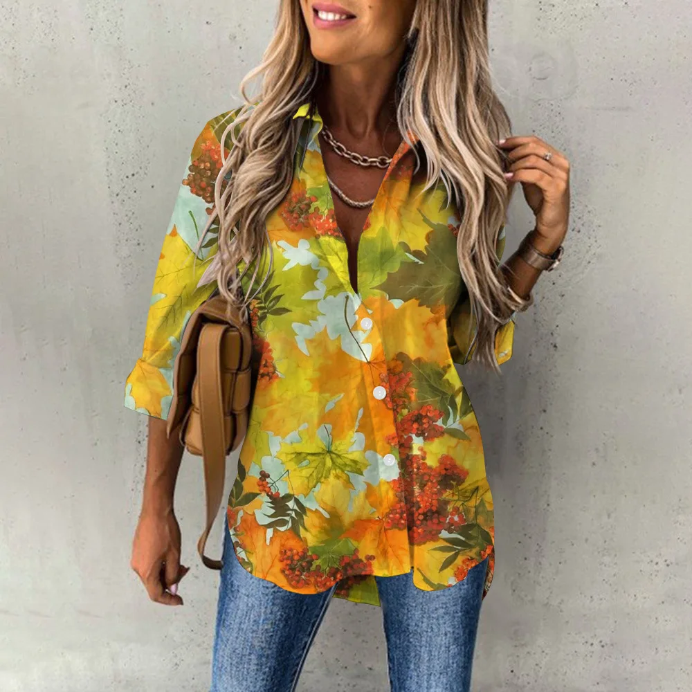 Color: Blue, Size: L - Ladies Long Sleeved Shirt Vacation Style Coconut Tree 3D Digital Printed Button Up Collar Loose Casual Ladies Blouse 2024 Autumn