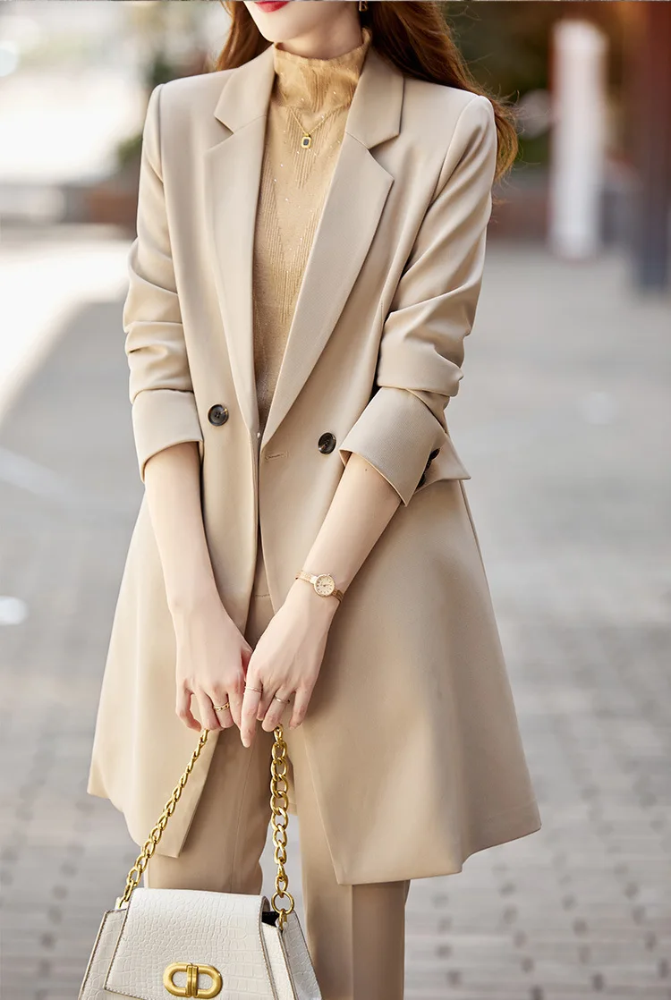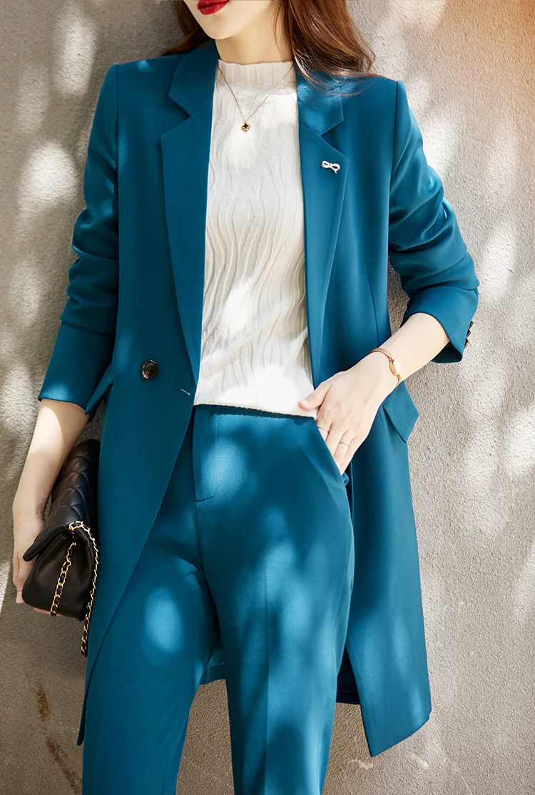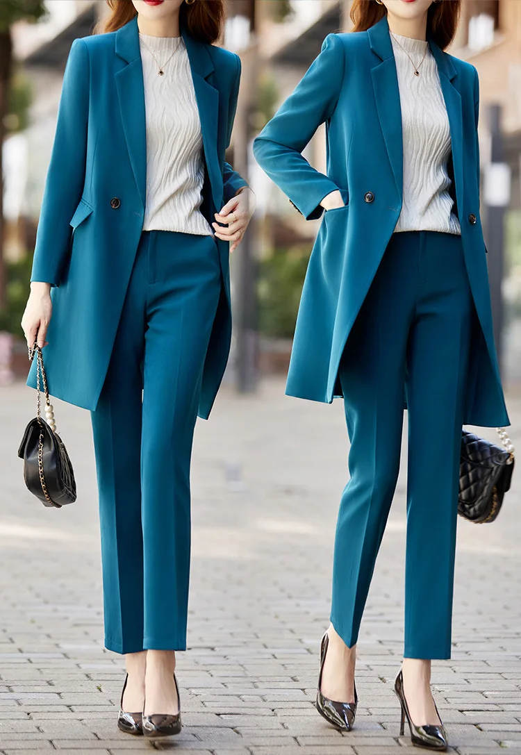 Color: Blue, Size: L, Ships From: CHINA - High End Office Professional Women's Blazer Pants 2-Piece Set Fall Fashion Long Female Jacket Over Business Suit Casual Trousers