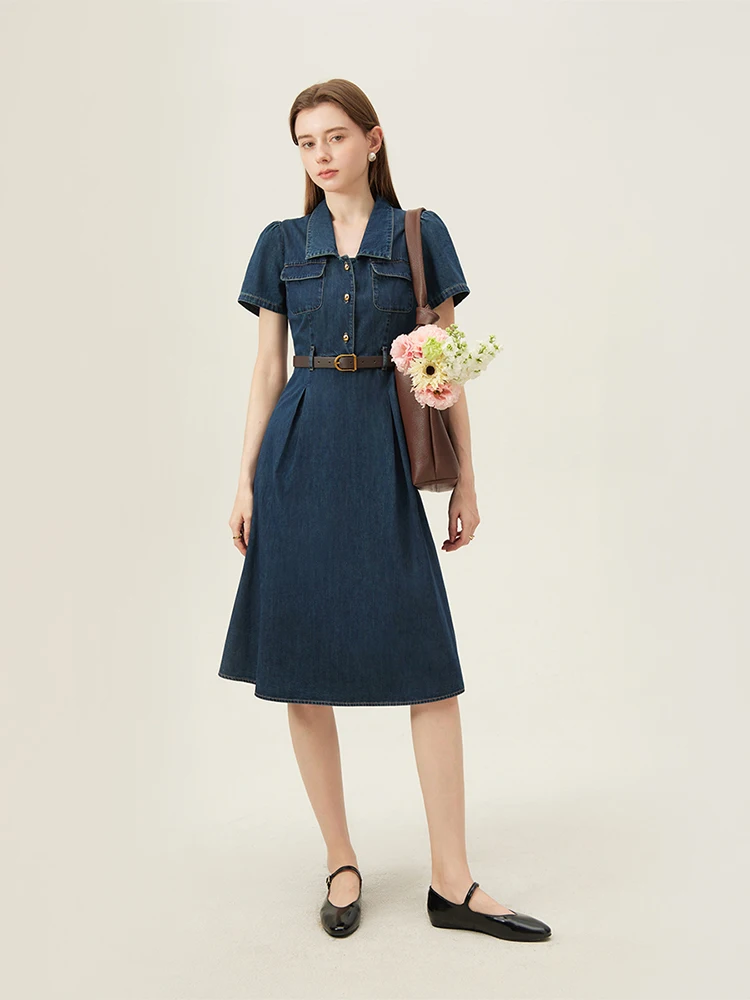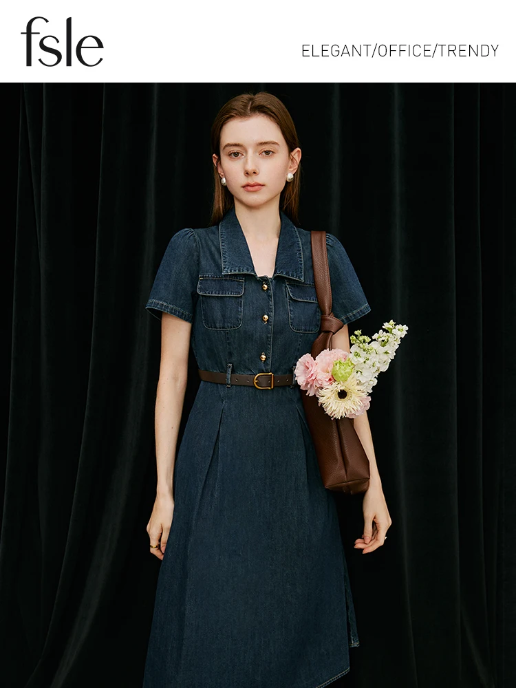 Color: Blue, Size: M - FSLE French Temperament Elegant Retro Denim Dress For Women 2024 Summer New Design High Waist Versatile Long Dress 24FS12236