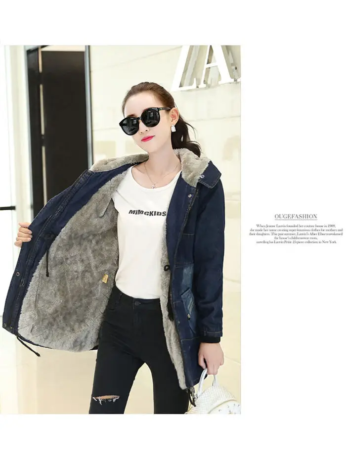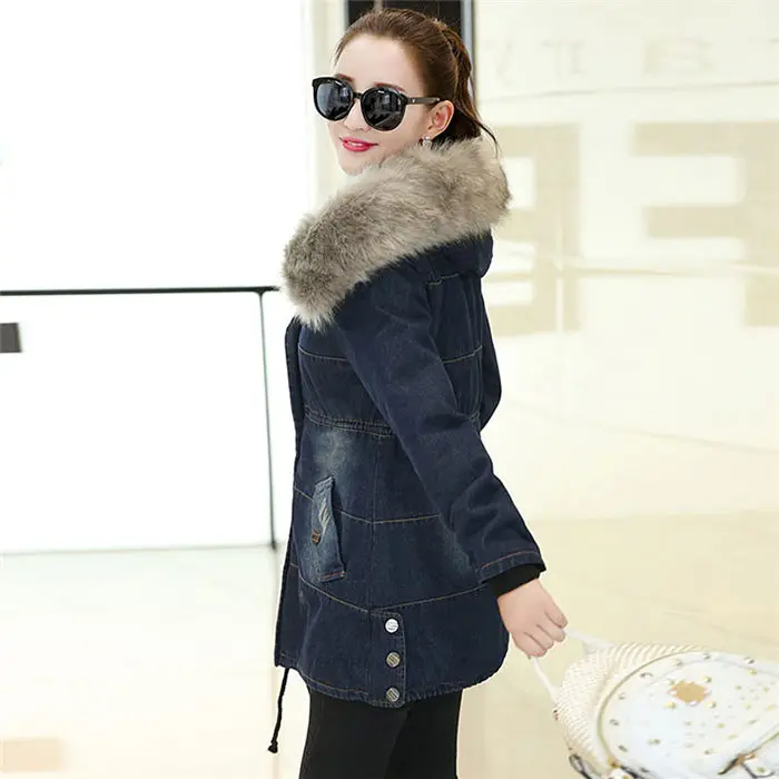 Color: Blue, Size: S - 2019 New Plus Velvet Padded Coat Women Winter Denim Jacket With Large Fur Collar Denim Jacket Hooded Warm Cotton Clothing f1911