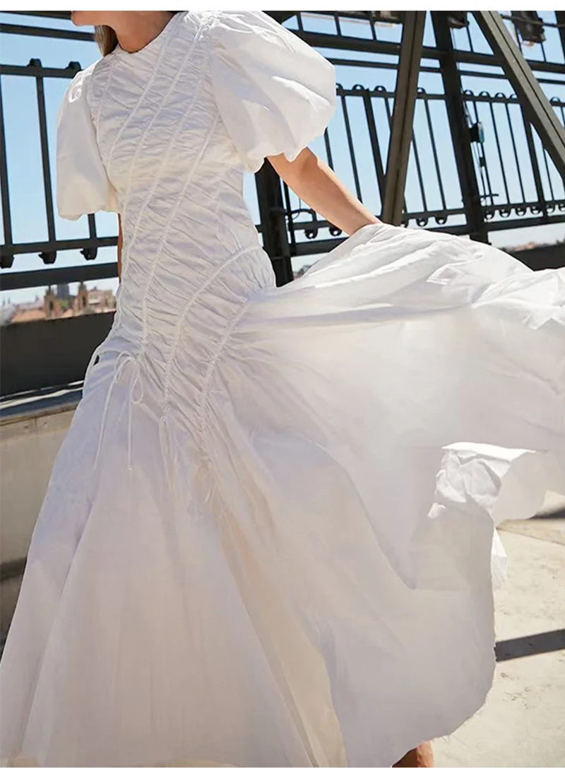 Color: Blue, Size: XL - 2025 summer women's new round neck lantern short sleeve irregular stitching drawstring dress slim dinner temperament long dress