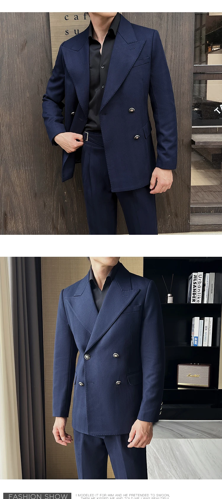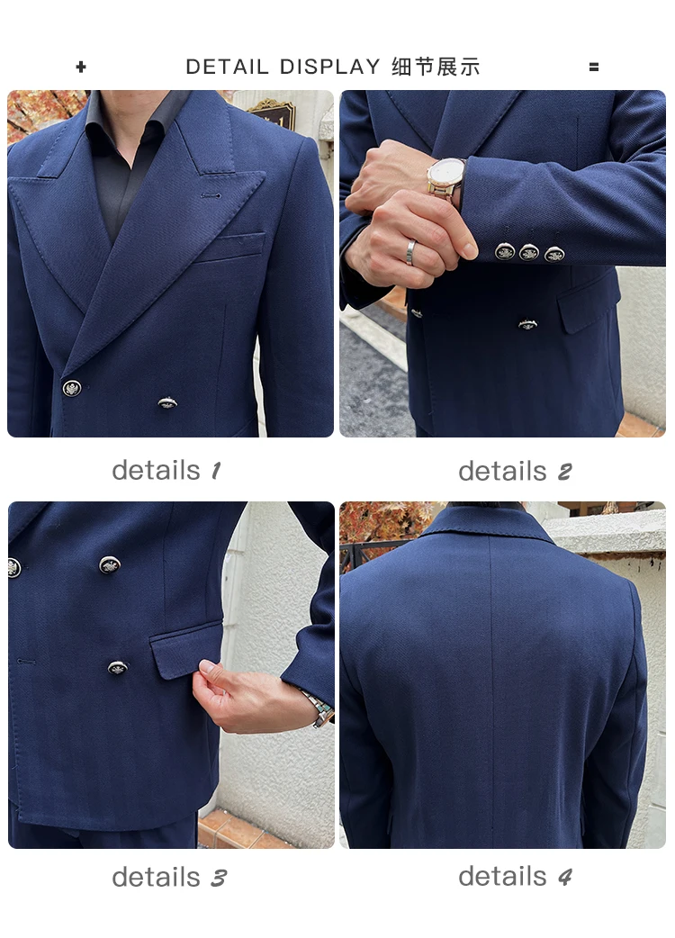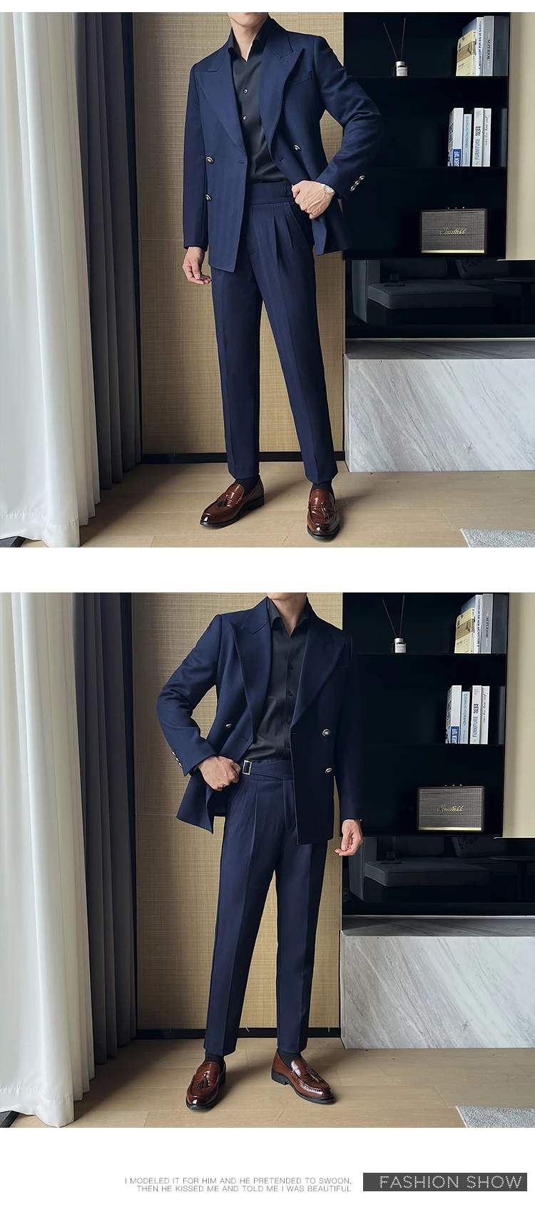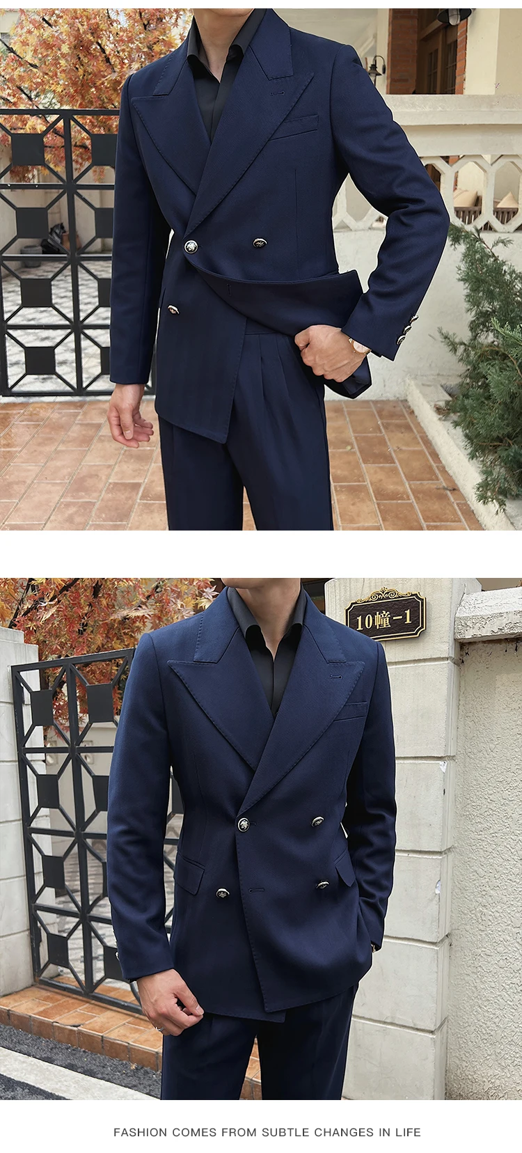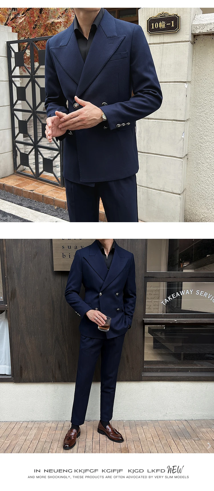 Color: Blue, Size: XL - 2Pieces Jackets+Pants Design High Quality Men's Set Elegant Fashion Double Breasted Thick Wedding Dress Blazers And Trousers Set