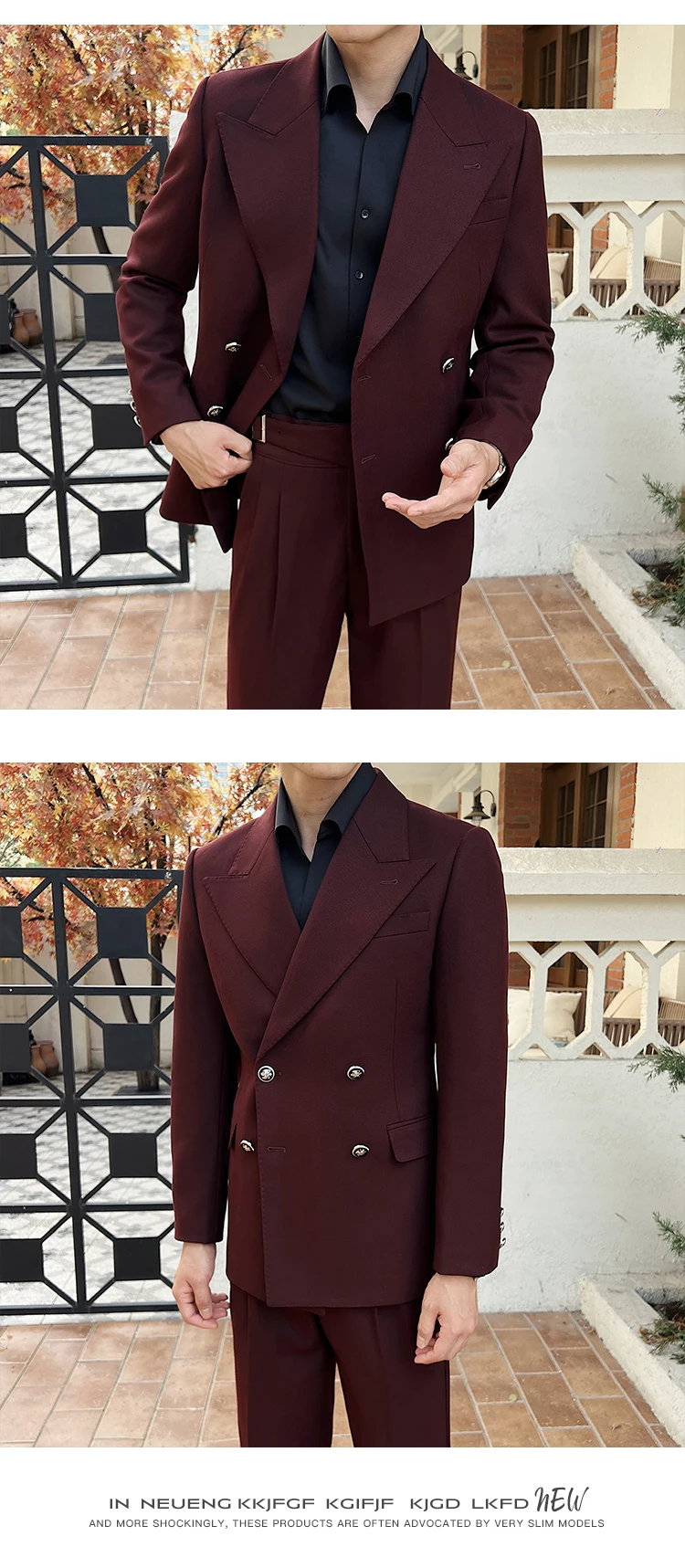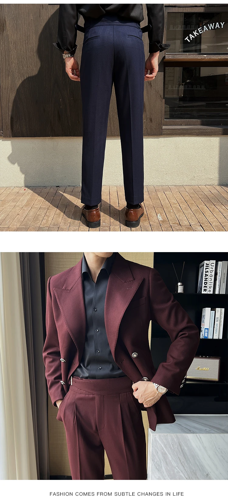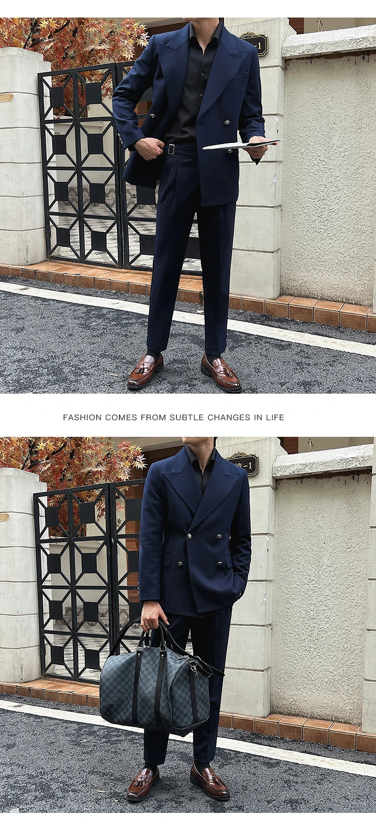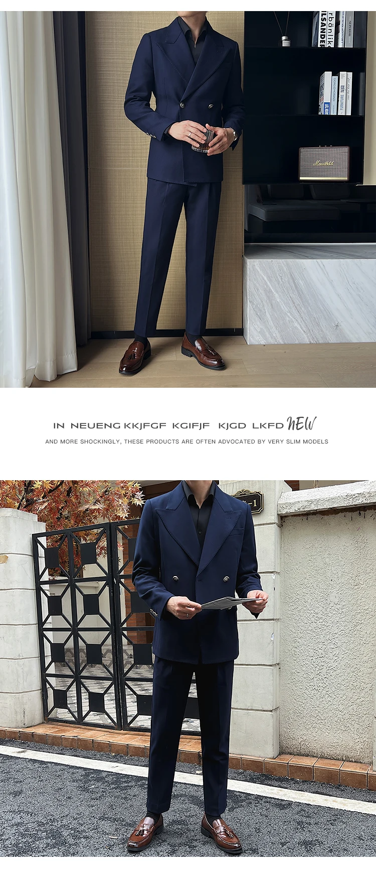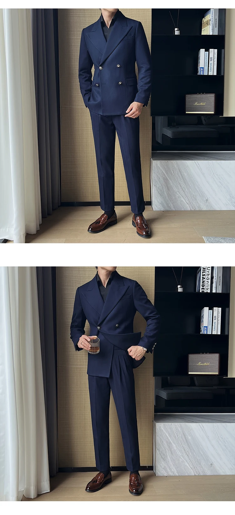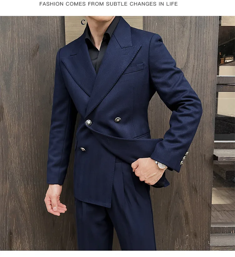 Color: Blue, Size: XL - 2Pieces Jackets+Pants Design High Quality Men's Set Elegant Fashion Double Breasted Thick Wedding Dress Blazers And Trousers Set