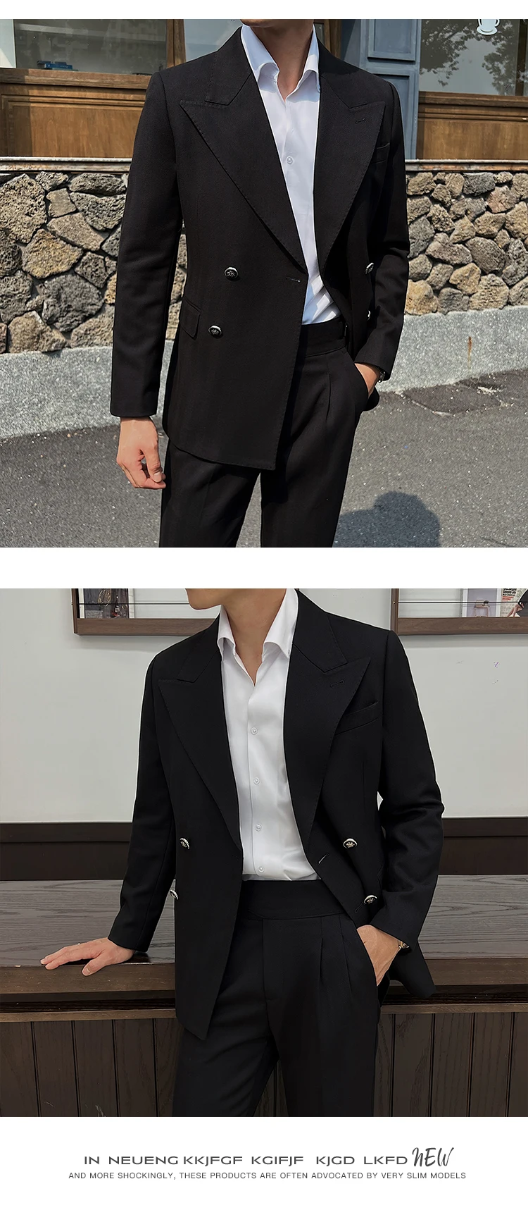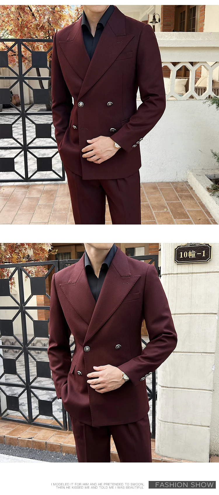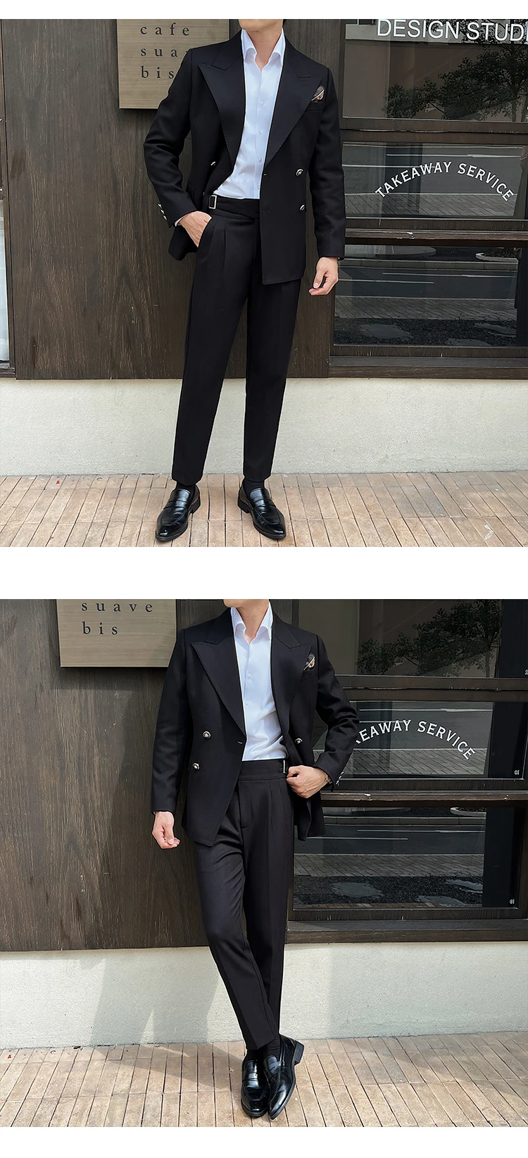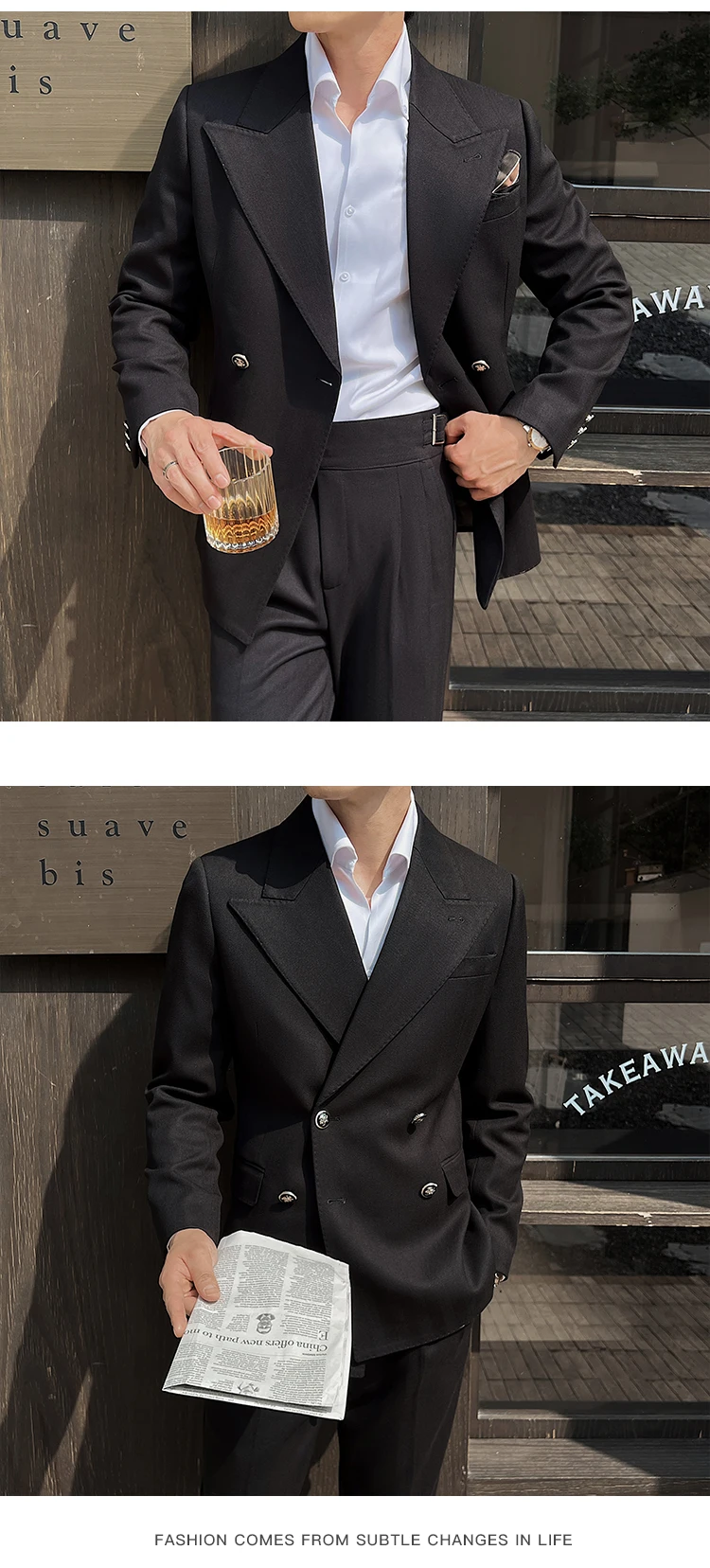 Color: Blue, Size: XL - 2Pieces Jackets+Pants Design High Quality Men's Set Elegant Fashion Double Breasted Thick Wedding Dress Blazers And Trousers Set