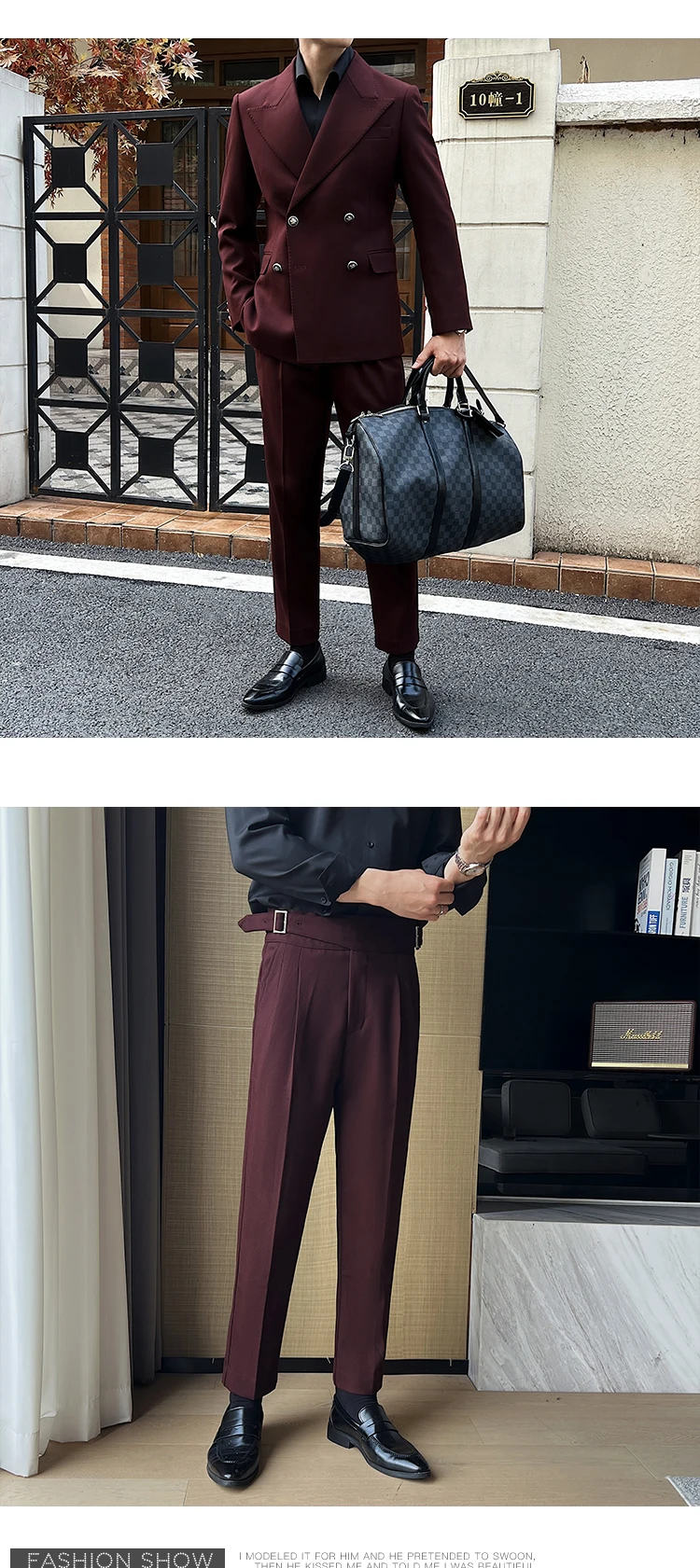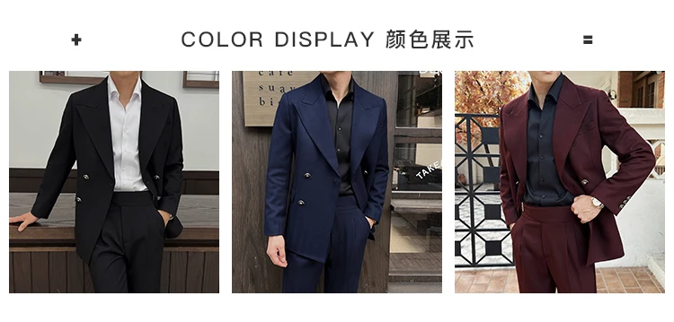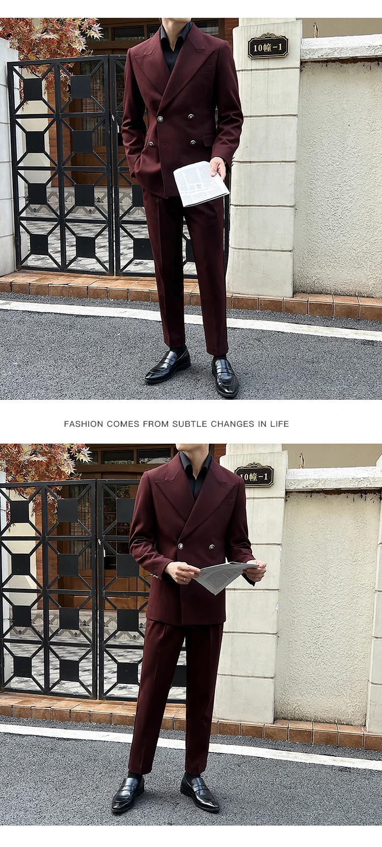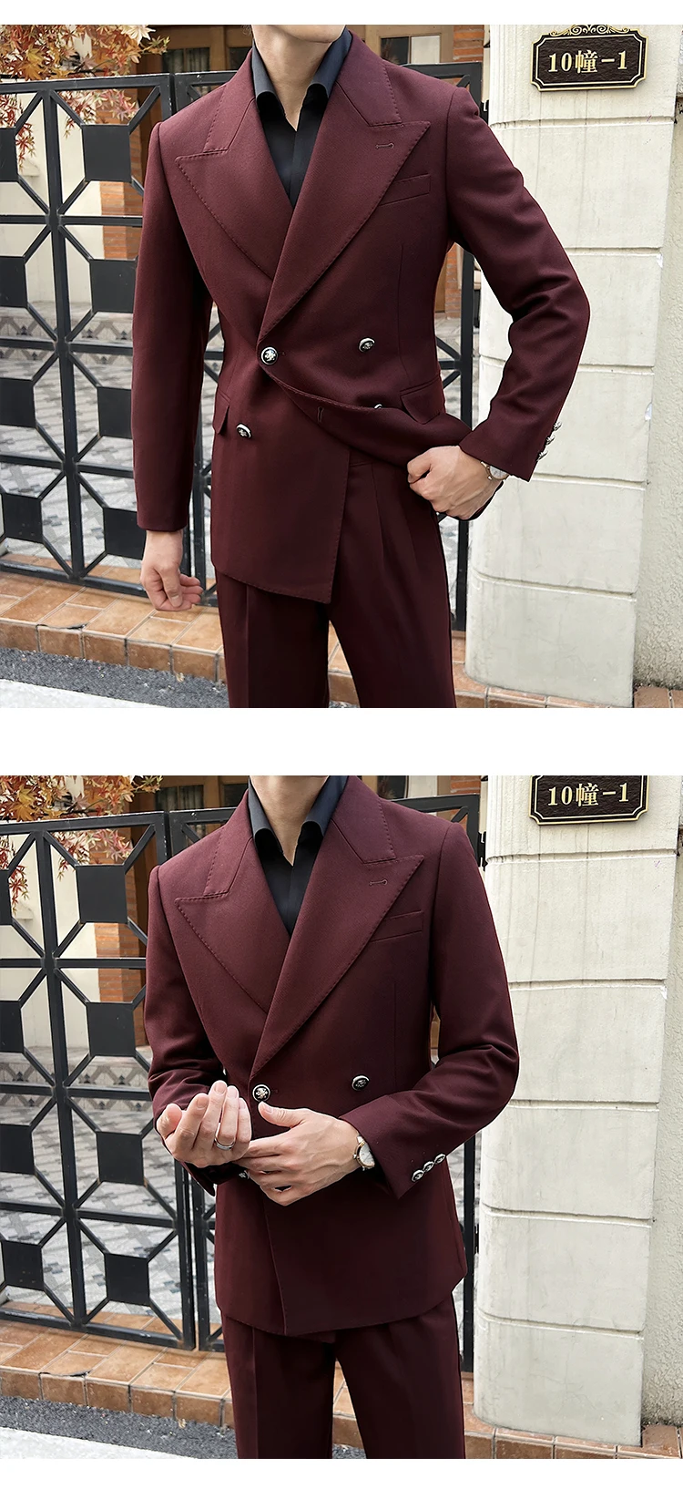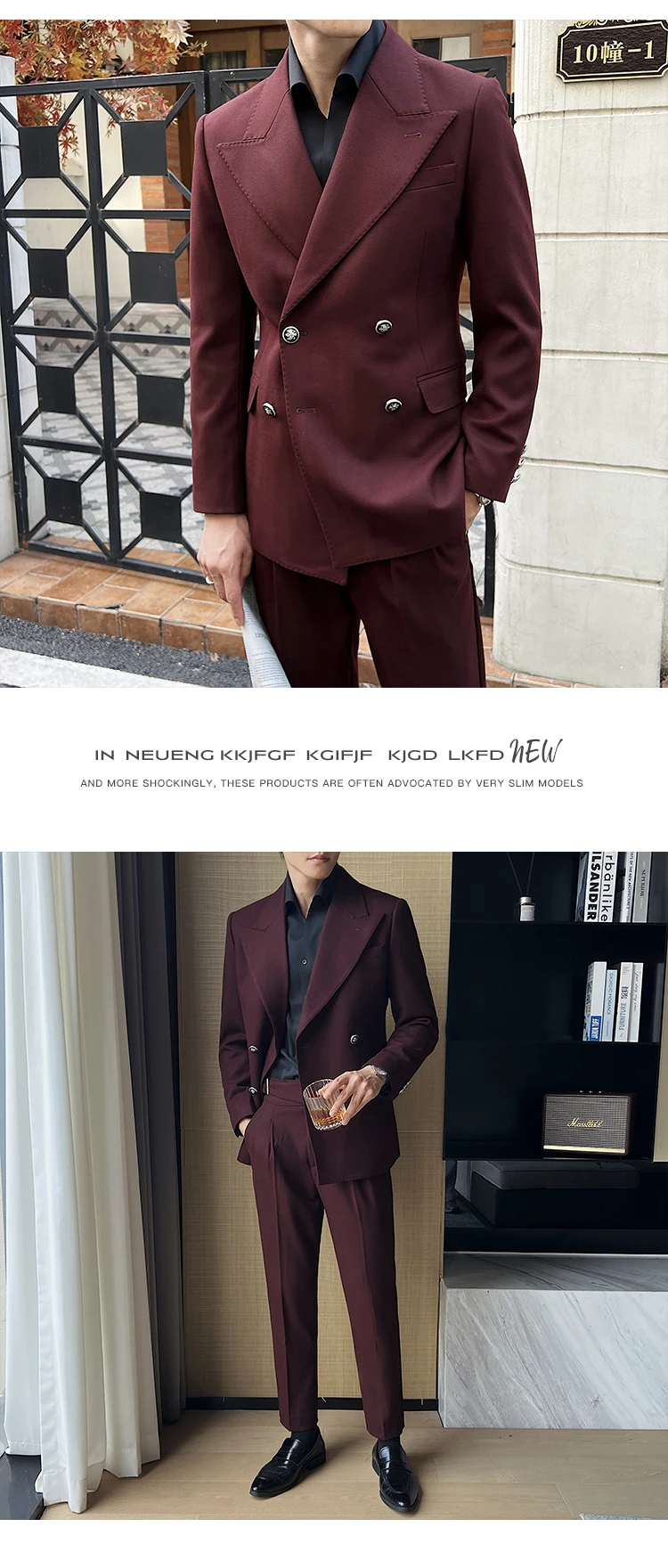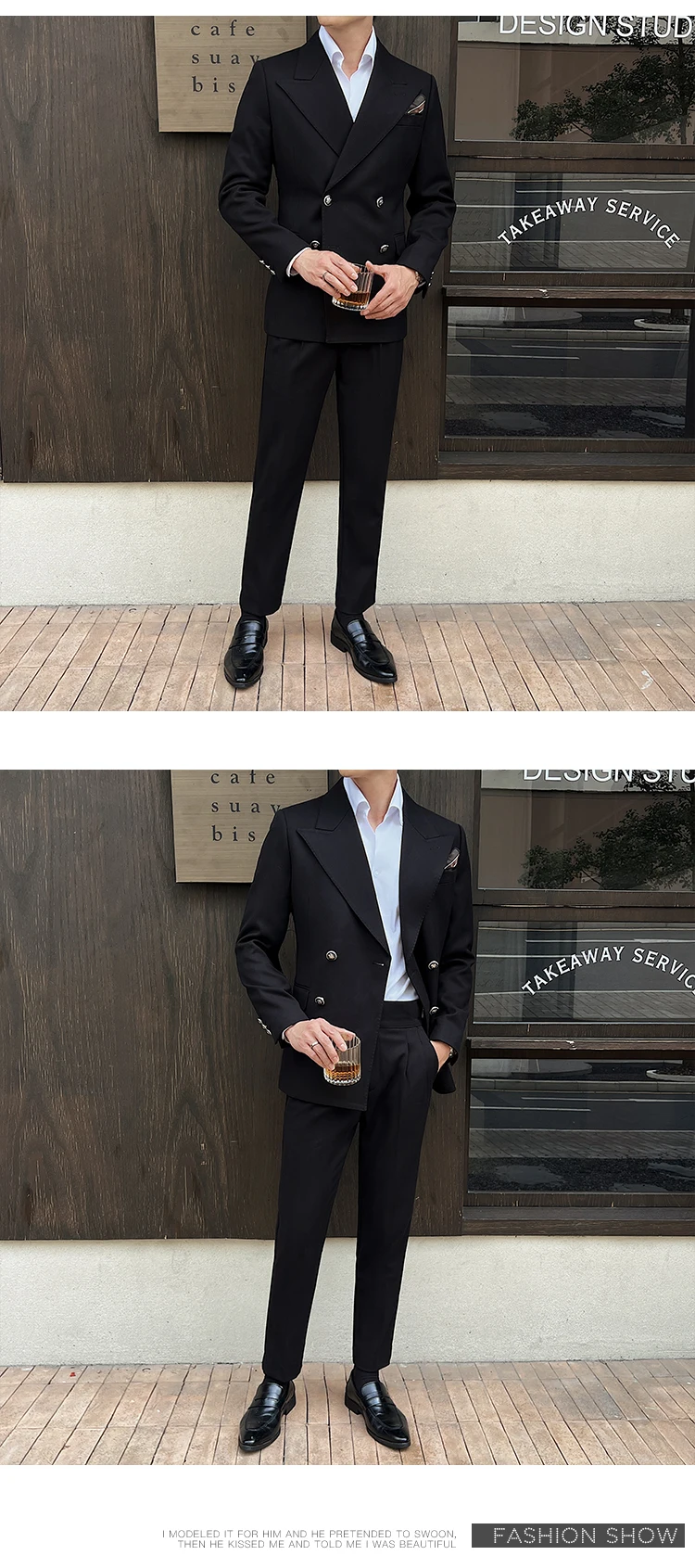 Color: Blue, Size: XL - 2Pieces Jackets+Pants Design High Quality Men's Set Elegant Fashion Double Breasted Thick Wedding Dress Blazers And Trousers Set