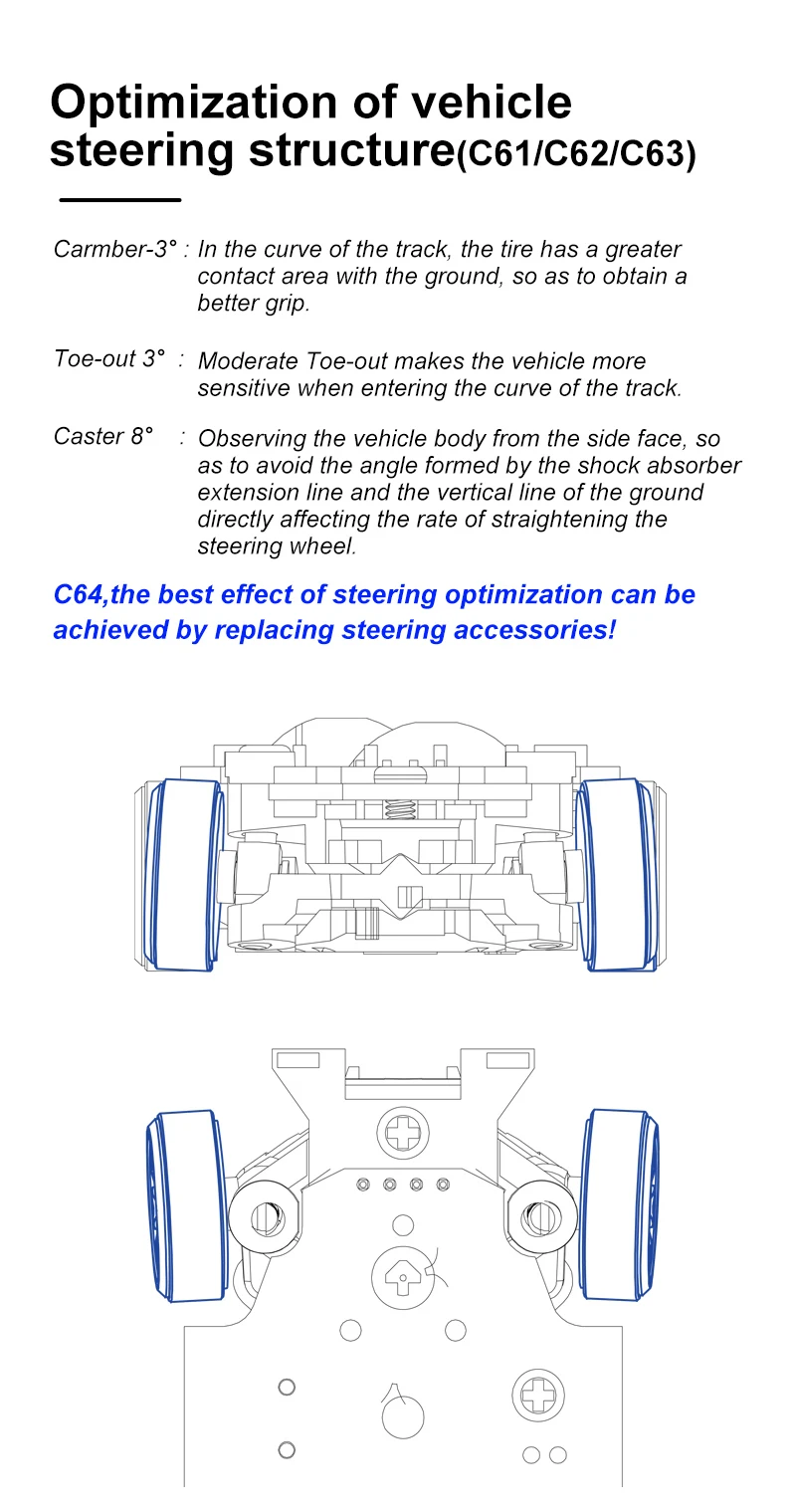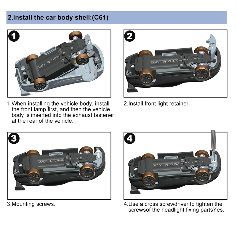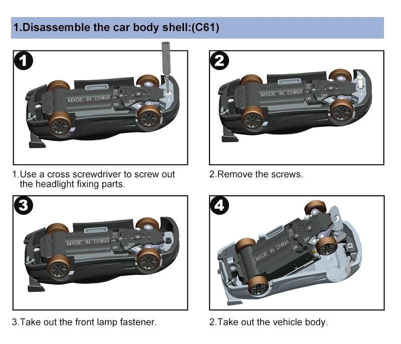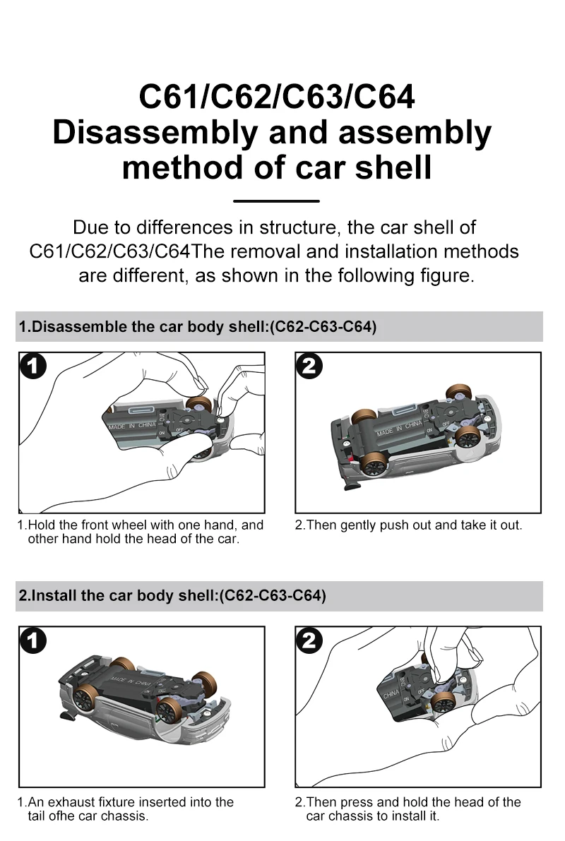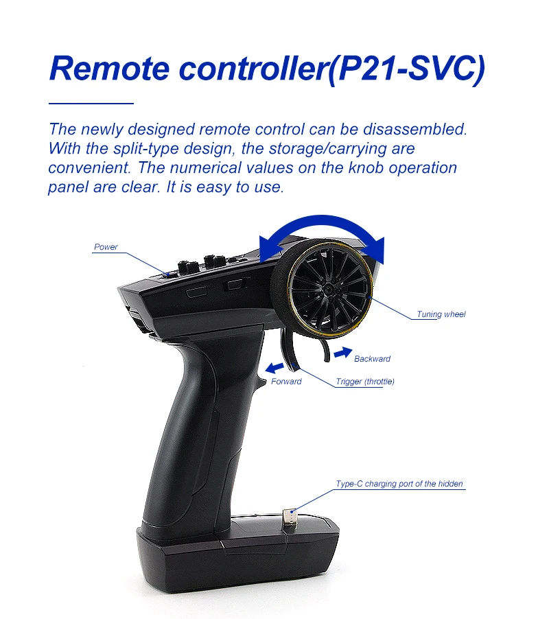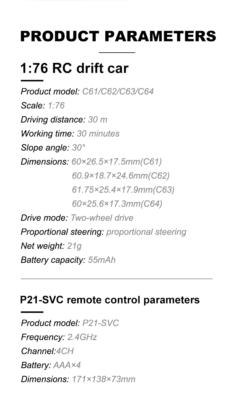 Model Name:C61/C62/C63/C64 Drift RC car Frequency Bran:2.4GHz 1:76 RC car size:60*26.5*17.5mm(C61)/60.9*18.7*24.6mm(C62)/61.75*25.4*17.9mm(C63)/60.9*25.6*17.3mm(C64) Product Net Weight:450g Certificate:CE/FCC/ROHS/CCC Control Distance:30M Playing time: 30min Charging battery: 3.7V  55mAh LiPo Trim function: Yes REV: Steering reverse What remote conrol can fit this car:Turbo Racing P21-SVC transmitter ![]() 1* 1:76 C61/C62/C63/C64 Drift RC car 1* P21SVC 4CH remote 2* Car shell without color 1* Stainless Steel screwdriver 1* Type C charging cable 1* Packing box 1* User manual ![]() |