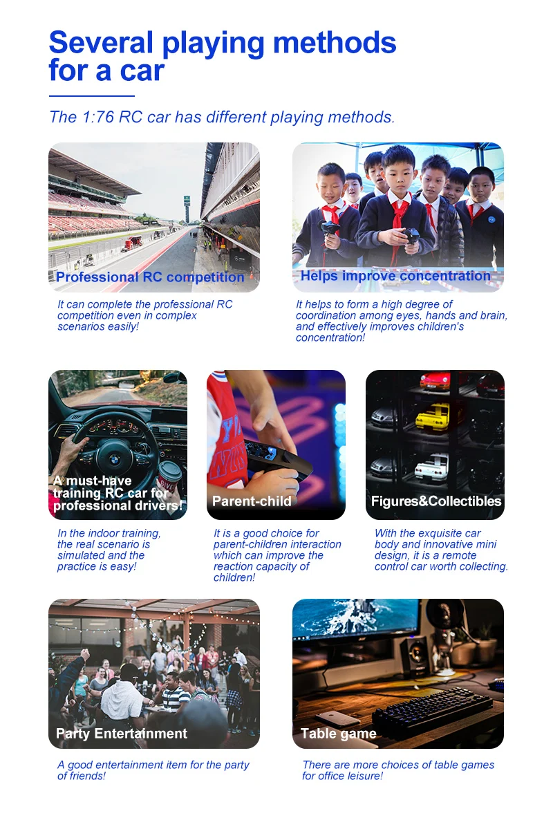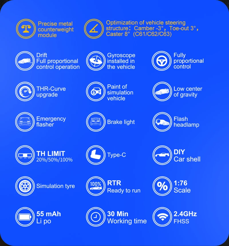 Model Name:C61/C62/C63/C64 Drift RC car Frequency Bran:2.4GHz 1:76 RC car size:60*26.5*17.5mm(C61)/60.9*18.7*24.6mm(C62)/61.75*25.4*17.9mm(C63)/60.9*25.6*17.3mm(C64) Product Net Weight:450g Certificate:CE/FCC/ROHS/CCC Control Distance:30M Playing time: 30min Charg ![]() ![]() |