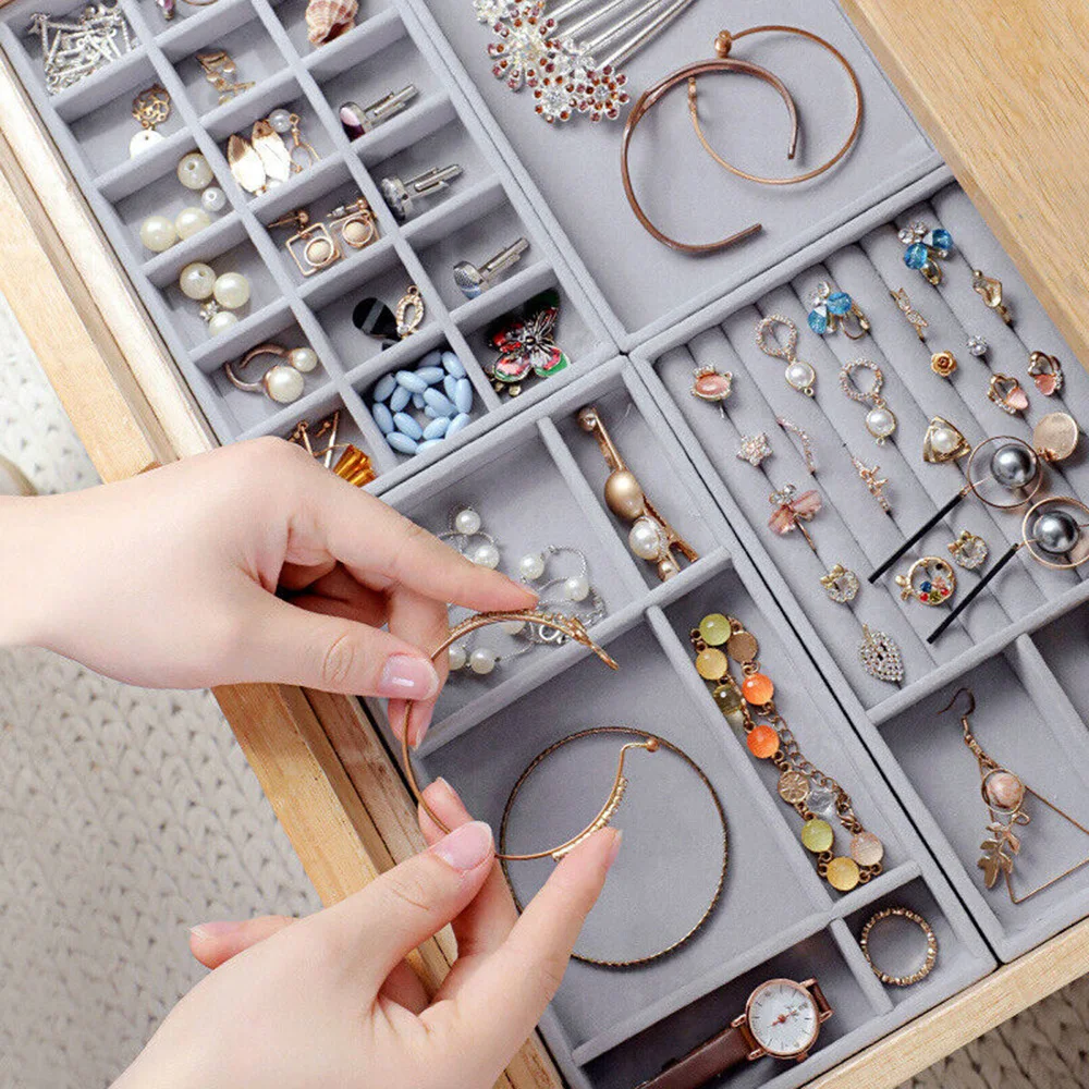 Color: Blue - Velvet Jewelry Storage Box Necklace Stackable Display Tray Bracelet Earring Organizers DIY Handicrafts Drawer Box Organizer Box