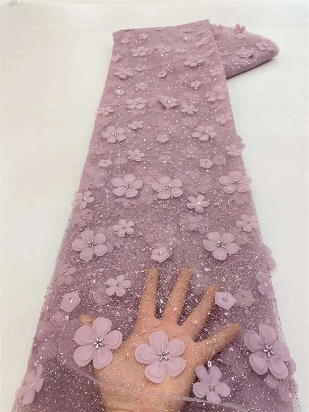 Color: BROWN, length: 5 yards, Width: 120cm - African Net Lace Sequin Fabric High quality Luxury Hand Beaded Embroidery Tulle Lace Fabrics for Nigeria Wedding Dress
