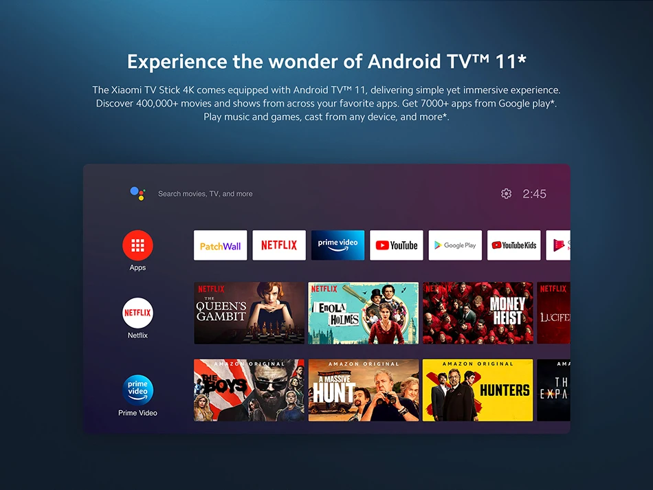 The Xiaomi TV Stick 4K comes equipped with Android TV™ 11, delivering simple yet immersive experience. Discover 400,000+ movies and shows from across your favorite apps. Get 7000+ apps from Google play*. Play music and games, cast from any device, and more*.