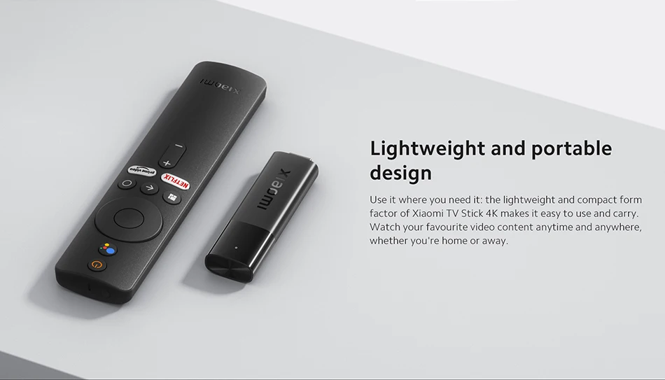 Use it where you need it: the lightweight and compact form factor of Xiaomi TV Stick 4K makes it easy to use and carry. Watch your favourite video content anytime and anywhere, whether you're home or away.