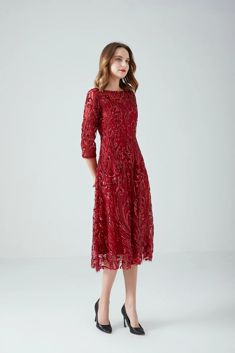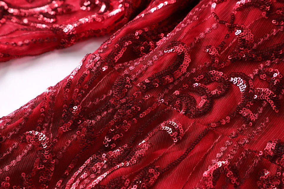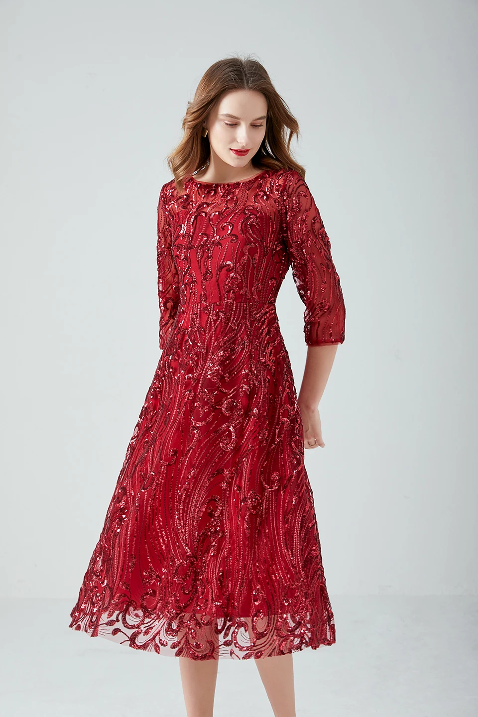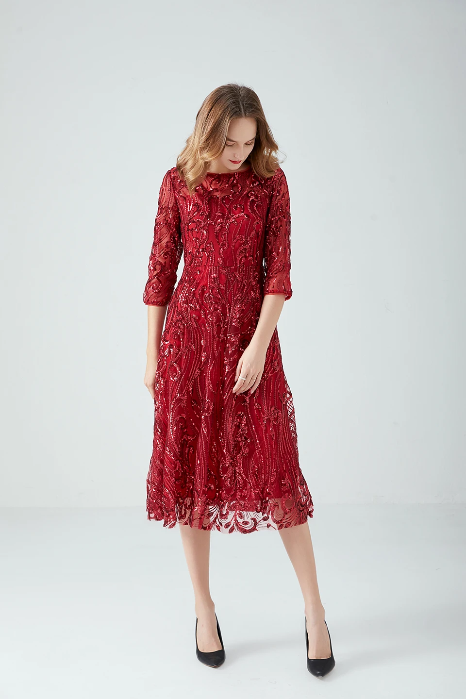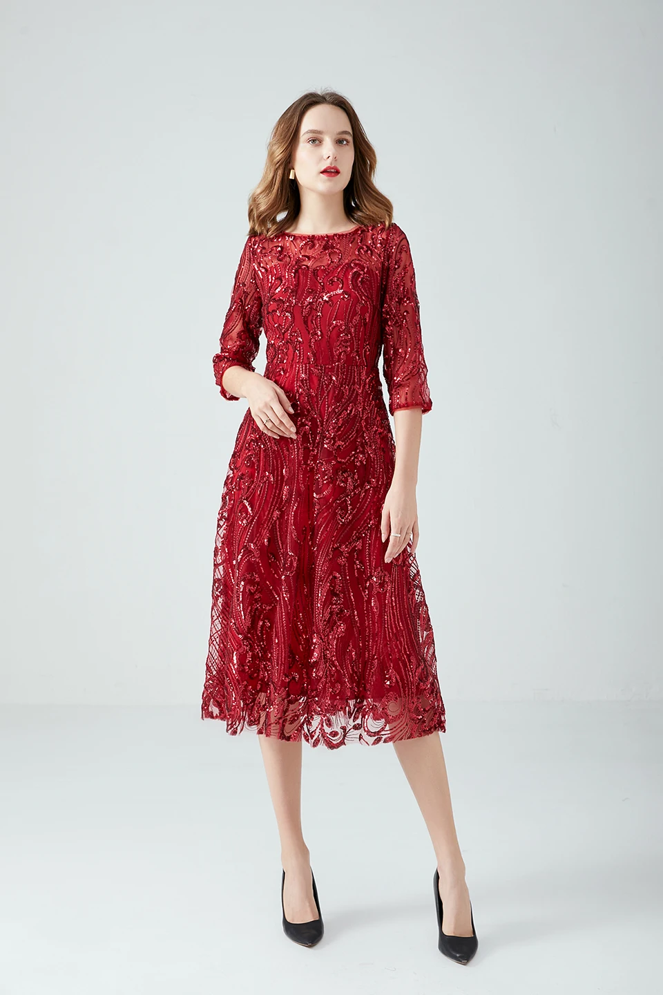 Color: Burgundy, Size: 4XL - Women's Lace Dress Sequin Evening Dresses Spring and Autumn New Wedding Banquet Broad Wife Fat Plus Size Long Dress Long Red