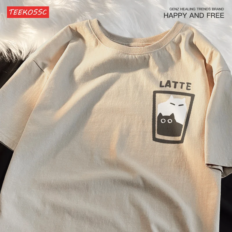 Color: Burgundy, Size: L - Mocha Latte Couple Outfit Cat Coffee Couple Male T-Shirts Graphic Cool Tee Shirt High-Quality Oversized Tshirt Comfort Soft