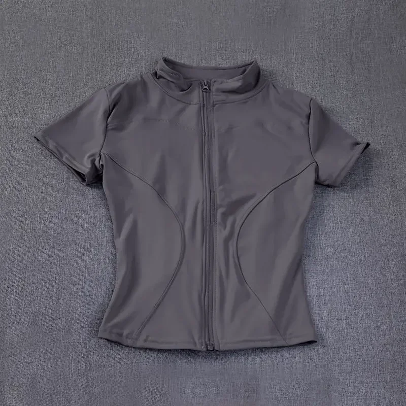 Color: Chocolate, Size: L - Summer High Quality Waist Slimming Training Tops Women's Quick-drying Tight Stand Collar Full Zipper Short Sleeves Yoga shirts