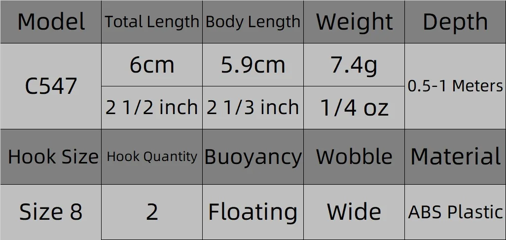 the fishing lure is 2 1/2 inch (6.4 cm) in length, weighs 1/4 oz (7.4 g), and has a shallow diving depth. The hook size recommended for this lure is 6, and it features a slow floating action when retrieved.