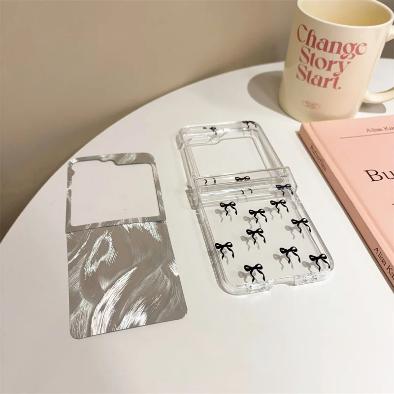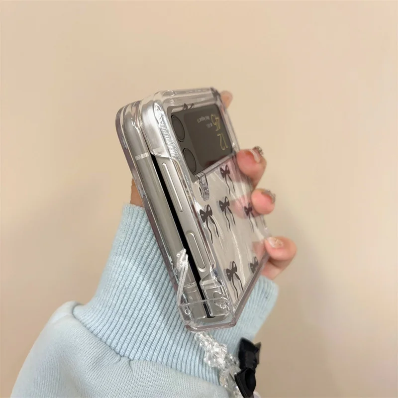 Color: Clear, Material: Nylon - For Samsung Galaxy Z Flip 3 4 5 6 Case Cute Pink Black Bow Feather Cards Bracelet Cover For Samsung Z Flip3 Flip4 ZFlip5